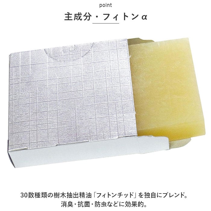 ・30数種類の樹木抽出精油「フィトンチッド」を独自にブレンド。消臭・抗菌・防虫などに効果的。