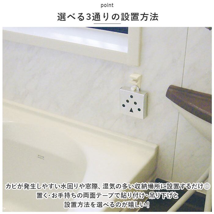 ・カビが発生しやすい水回りや窓際、湿気の多い収納場所に設置するだけ◎置く・お手持ちの両面テープで貼り付け・吊り下げと設置方法を選べるのが嬉しい!(※壁に取り付ける際、材質によりテープ跡が残る場合があります。吊り下げる際は裏面の吊り下げ用立ち上げミシン目部分を利用、フックは別途ご用意ください。)