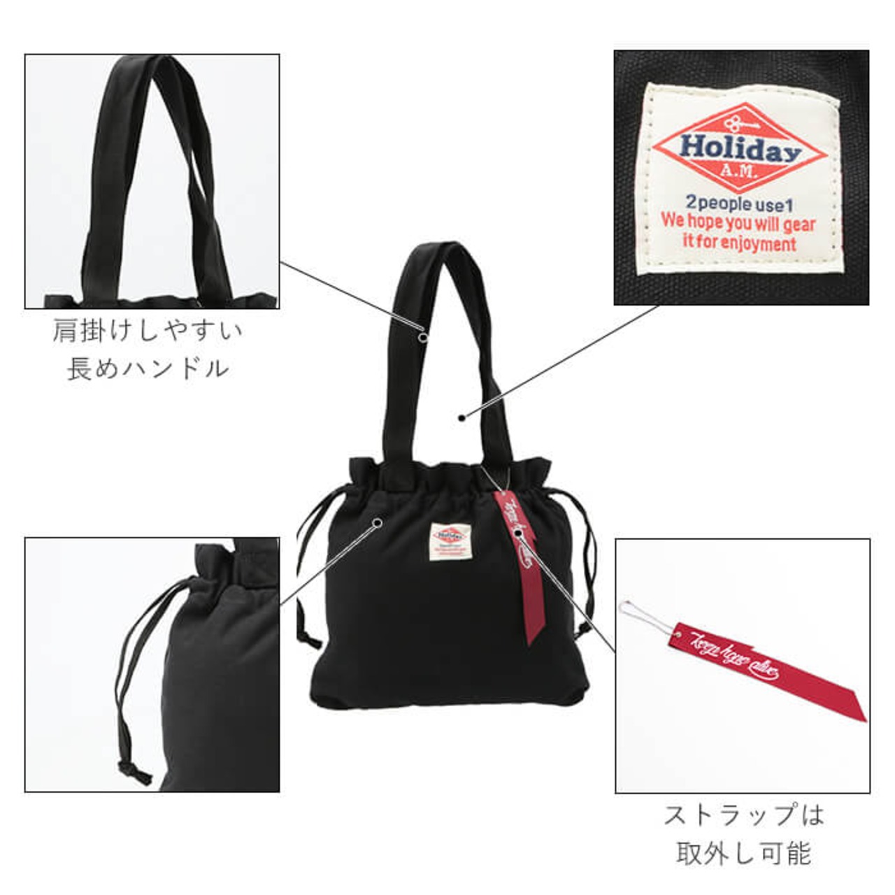 ・落ち着いたカラーの生地に、HolidayA.M.のロゴパッチを控え目に配置したシンプルなデザインで、男女共に使いやすいユニセックス仕様。「Keep Hope Alive」のセンテンスがプリントされた赤いテープ生地のストラップがお洒落なアクセントに。
