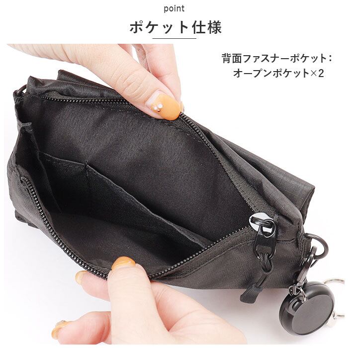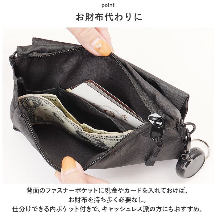 ・背面のファスナーポケットに現金やカードを入れておけば、お財布を持ち歩く必要なし。仕分けできる内ポケット付きで、キャッシュレス派の方にもおすすめ。