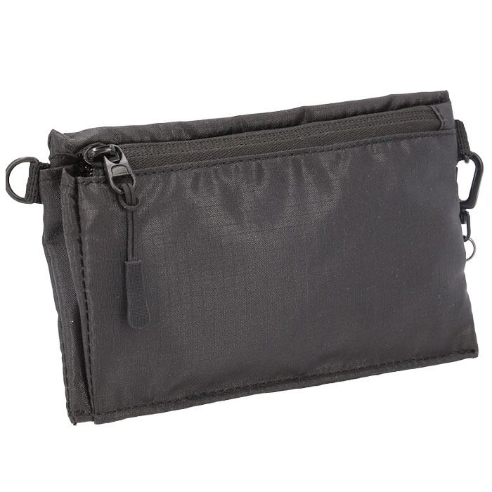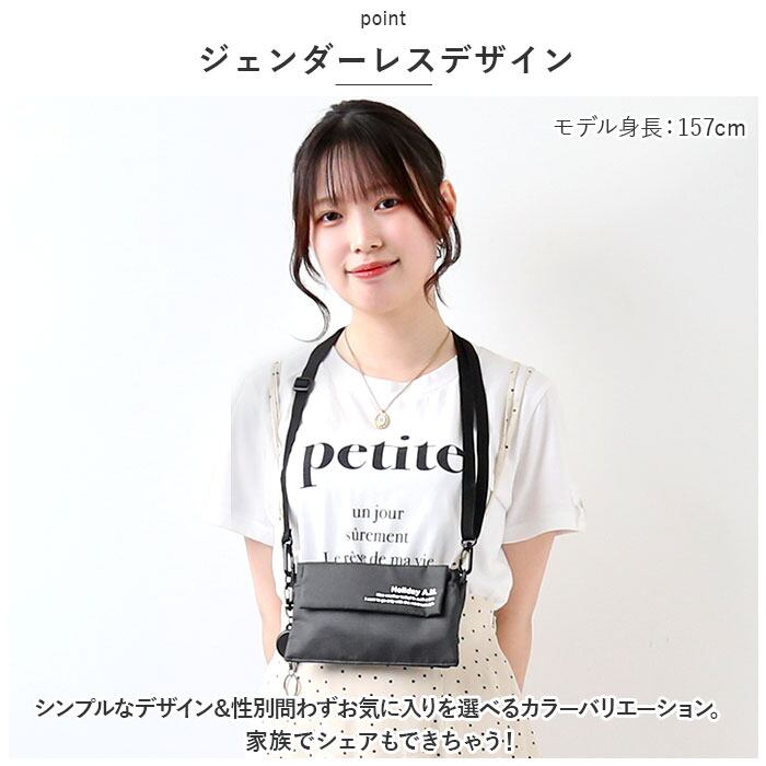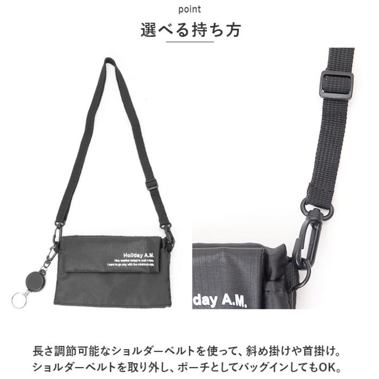・長さ調節可能なショルダーベルトを使って、斜め掛けや首掛け。ショルダーベルトを取り外し、ポーチとしてバッグインしてもOK。
