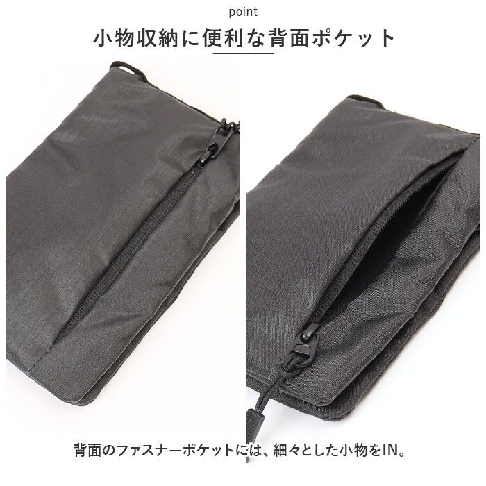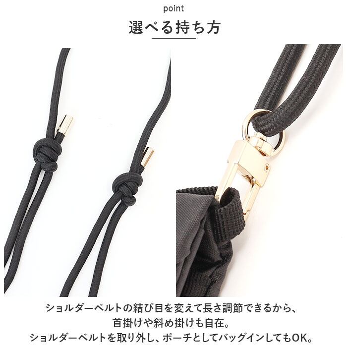 ・ショルダーベルトの結び目を変えて長さ調節できるから、首掛けや斜め掛けも自在。ショルダーベルトを取り外し、ポーチとしてバッグインしてもOK。