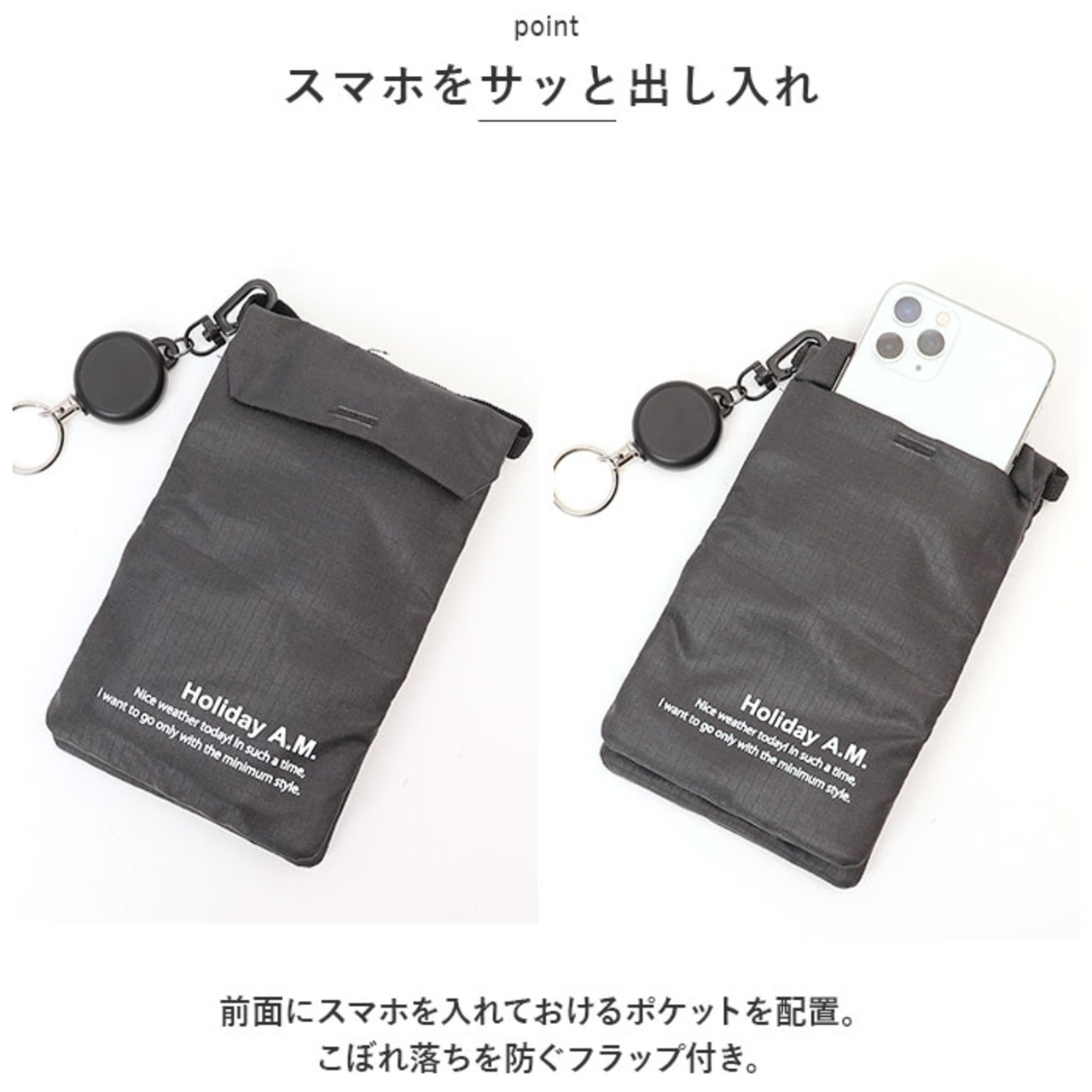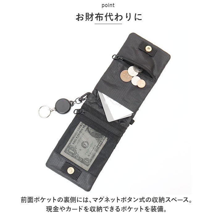 ・前面にスマホを入れておけるポケットを配置。こぼれ落ちを防ぐフラップ付き。