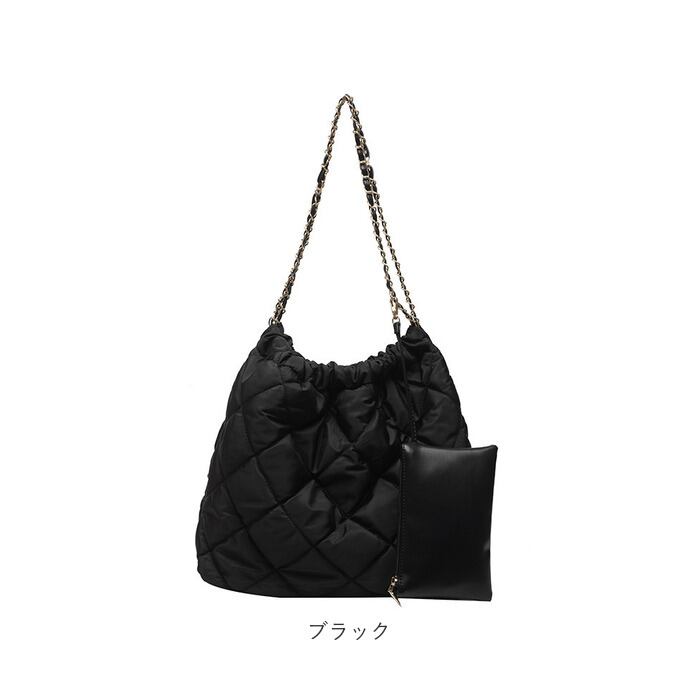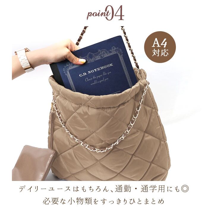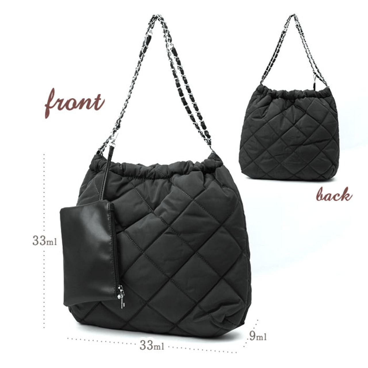 ・キラリと艶めくゴールドカラーのチェーンショルダーで、手持ちはもちろん、サッと肩に掛けられる2WAY仕様。ショルダーベルトをキュッと絞って、巾着風バッグにしてもOK!