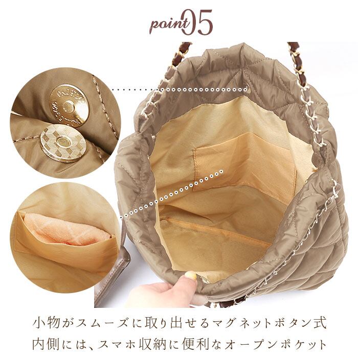 ・バッグの開口部は、小物がスムーズに取り出せるマグネットボタン式。収納した小物を程よく目隠しして、プライバシー面でも安心なつくり。