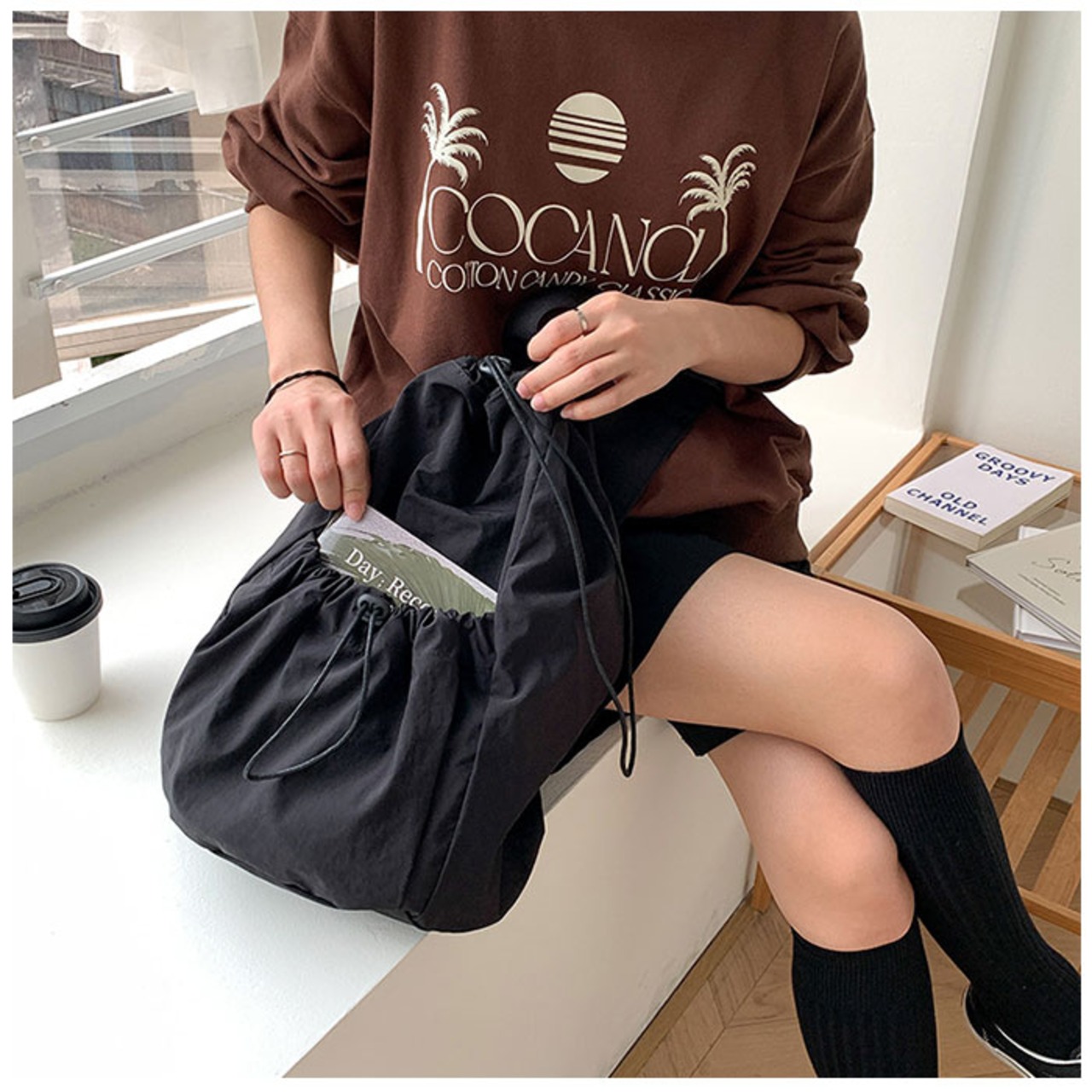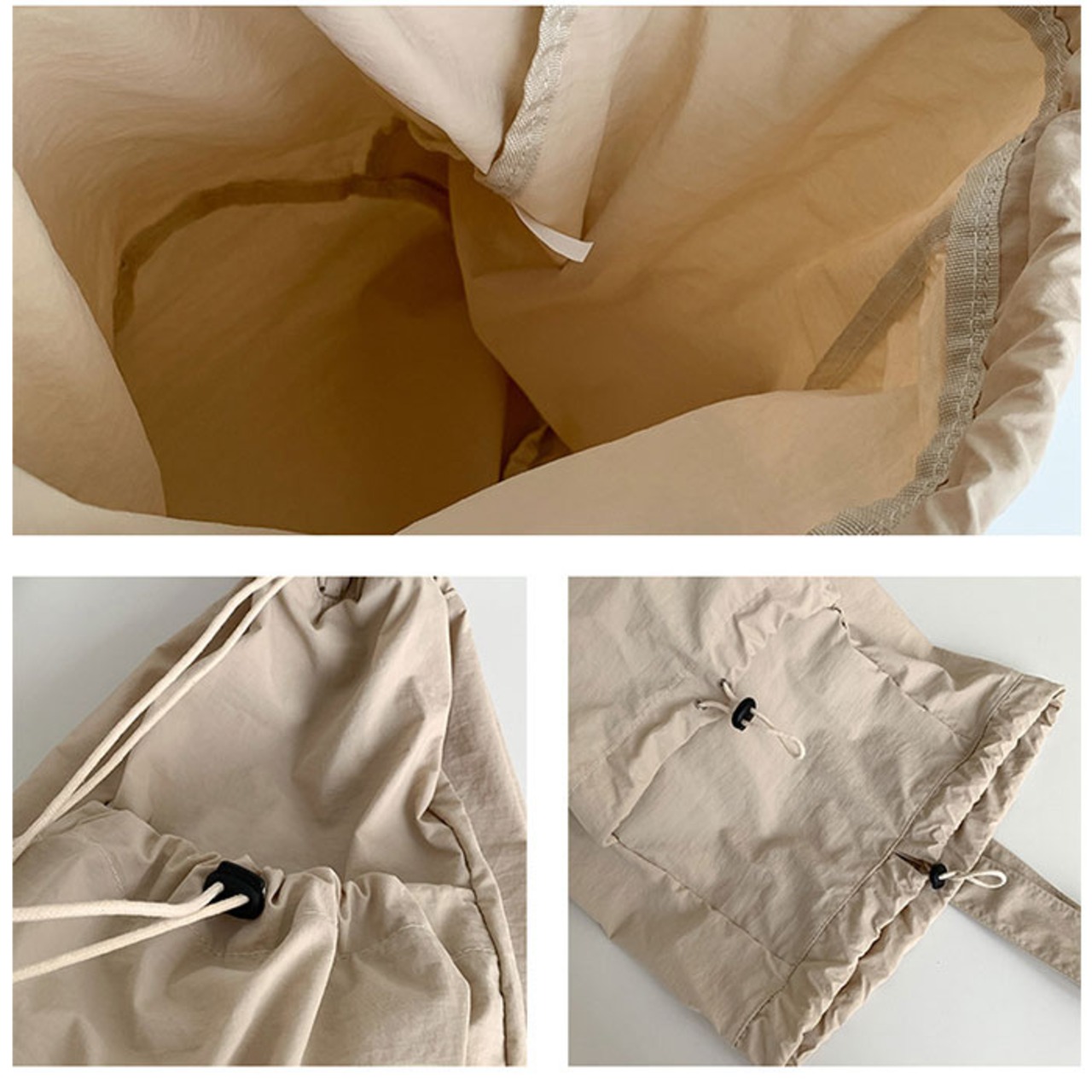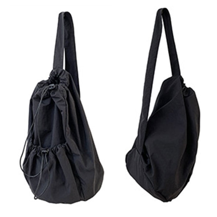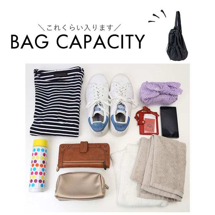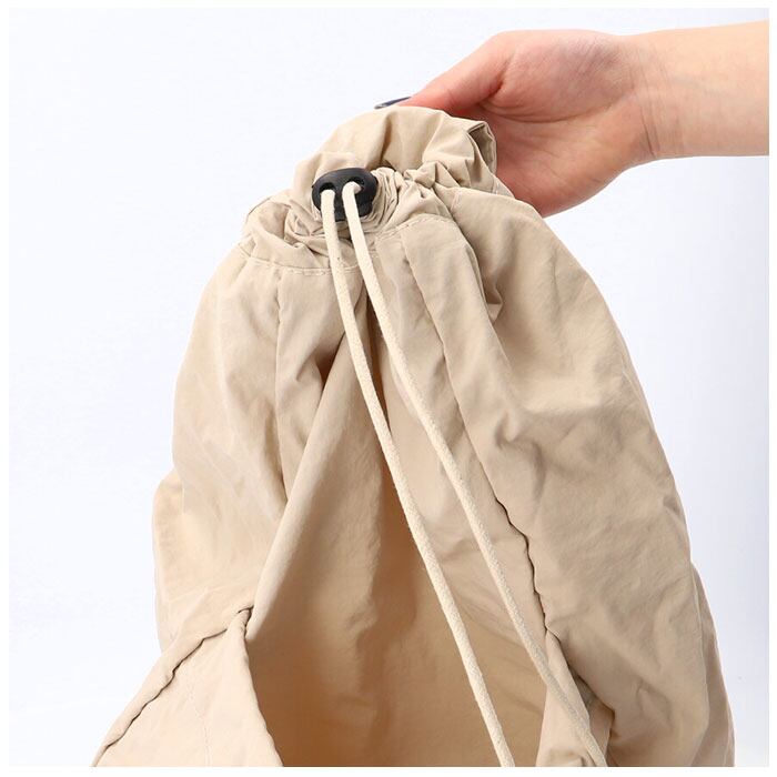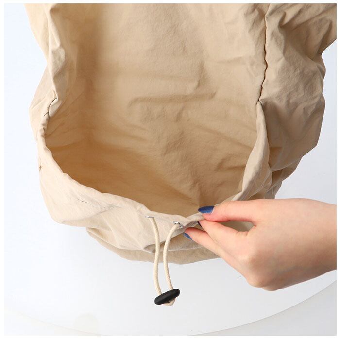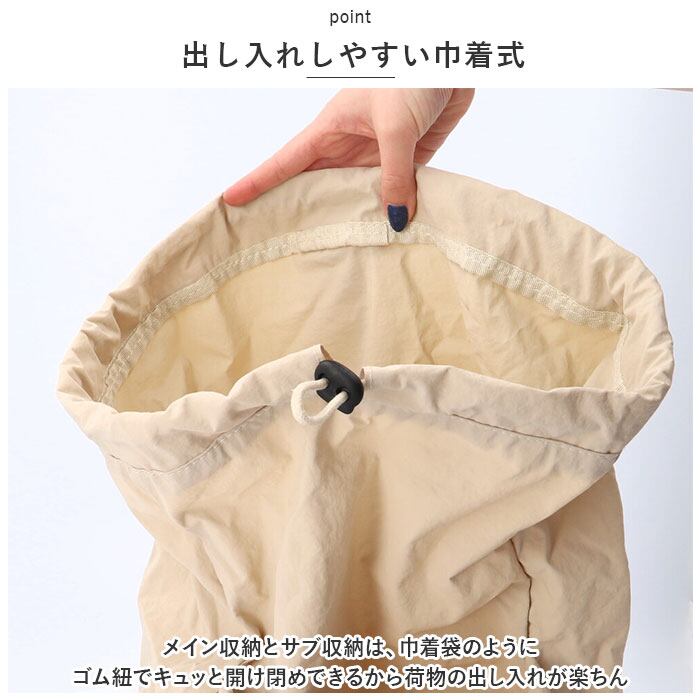 ・メイン収納とサブ収納は、巾着袋のようにゴム紐でキュッと開け閉めできるから荷物の出し入れが楽ちん。