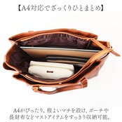 ・A4がぴったり。程よいマチを設け、ポーチや長財布などマストアイテムをすっきり収納可能。