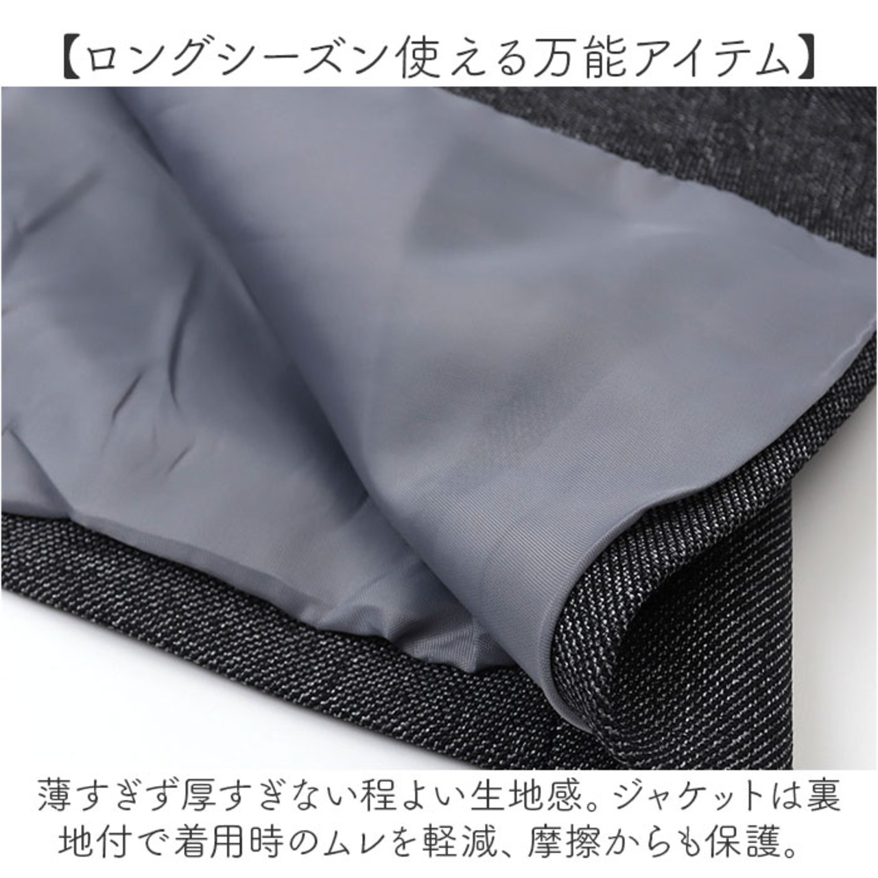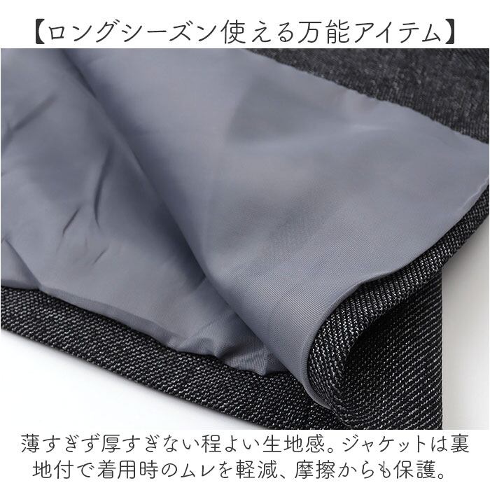 ・薄すぎず厚すぎない程よい生地感。ジャケットは裏地付で着用時のムレを軽減、摩擦からも保護。