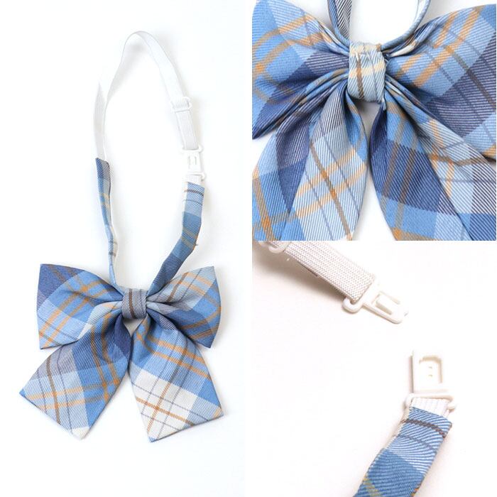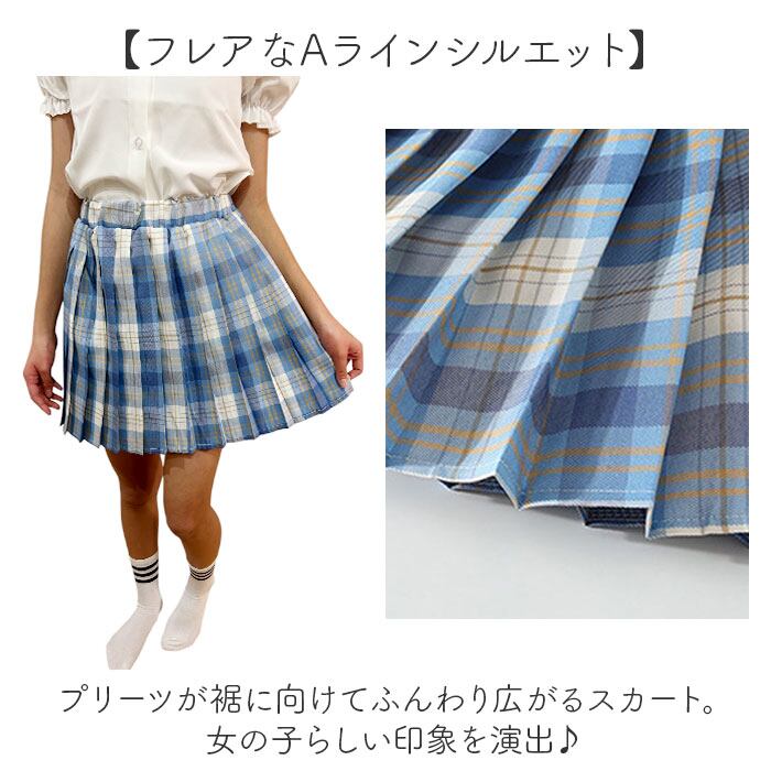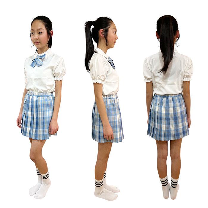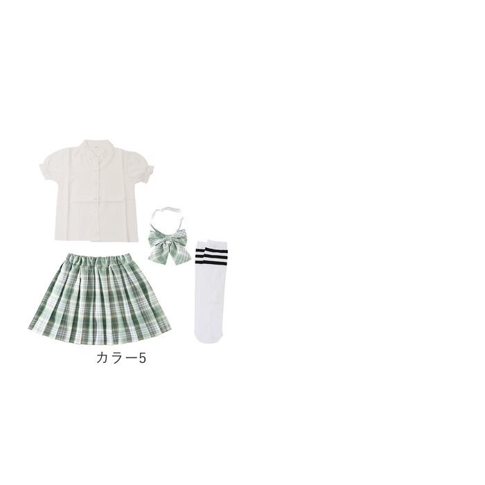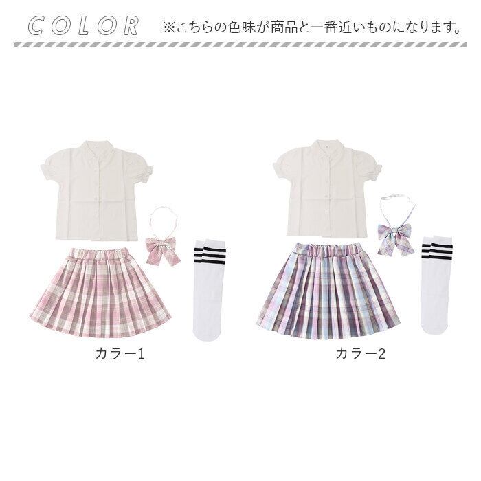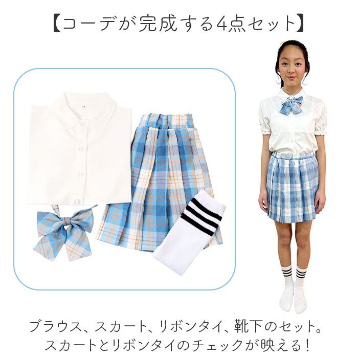 ・ブラウス、スカート、リボンタイ、靴下のセット。スカートとリボンタイのチェックが映える!