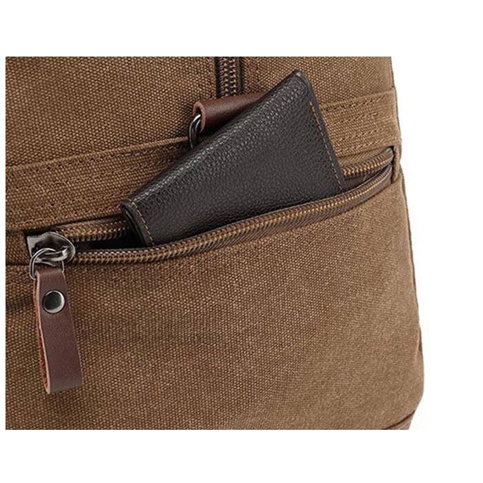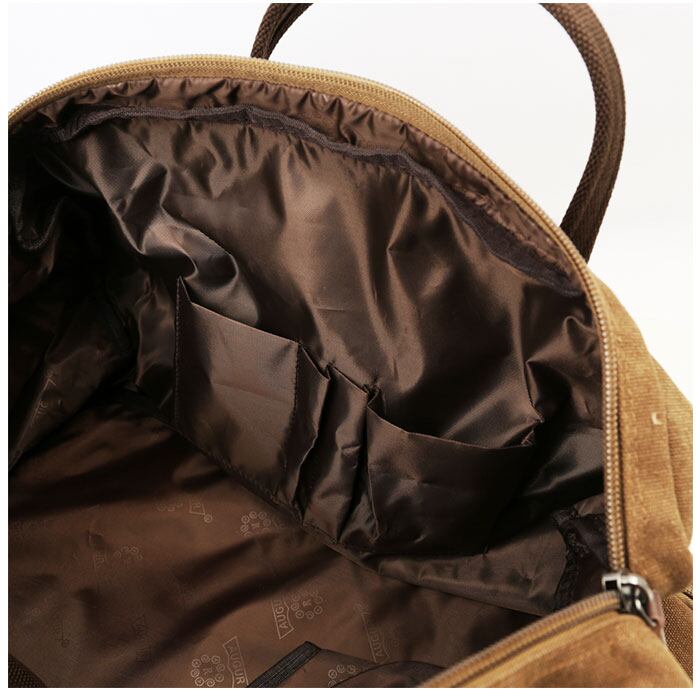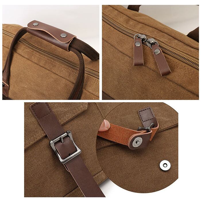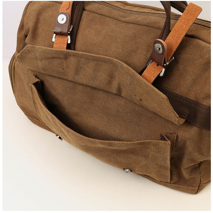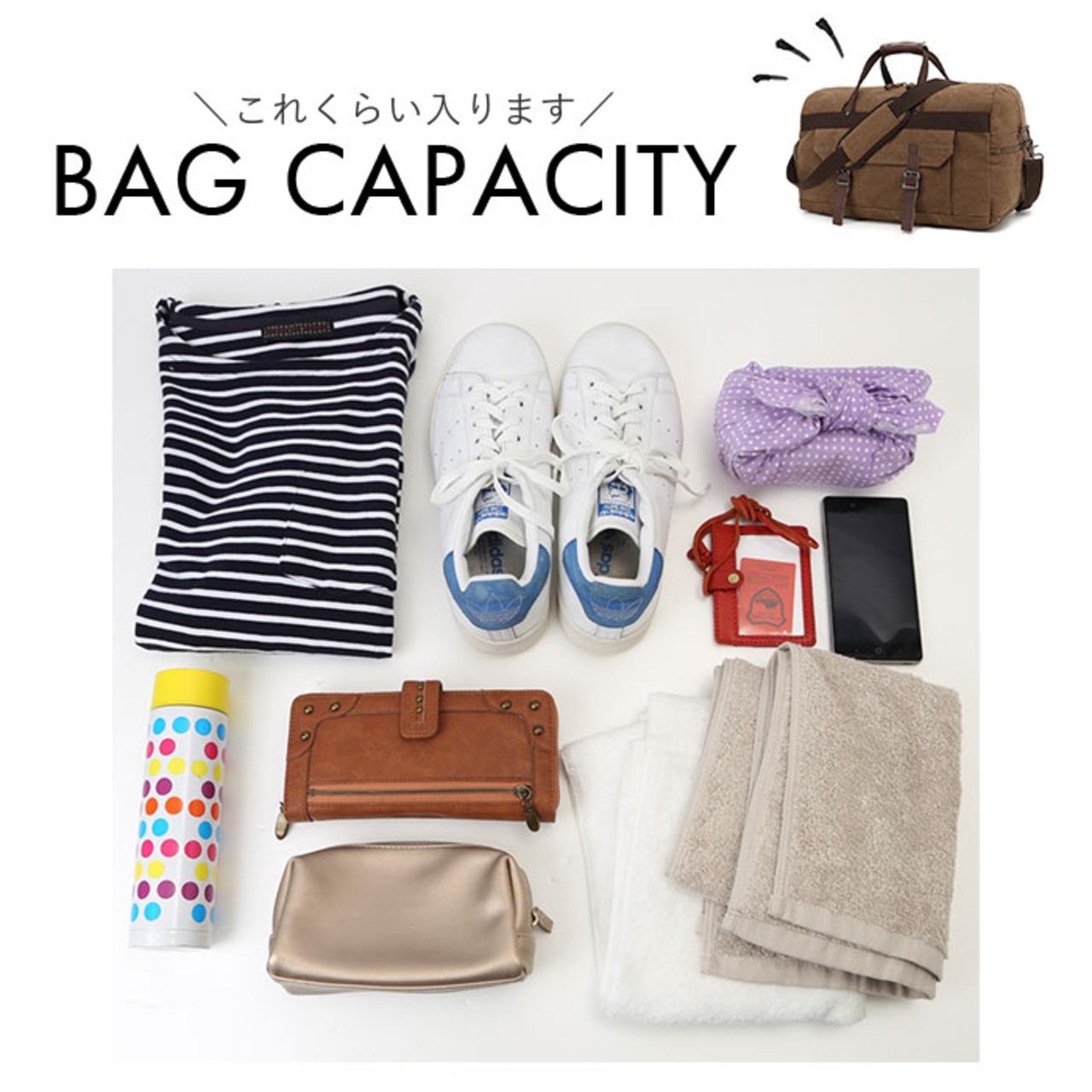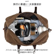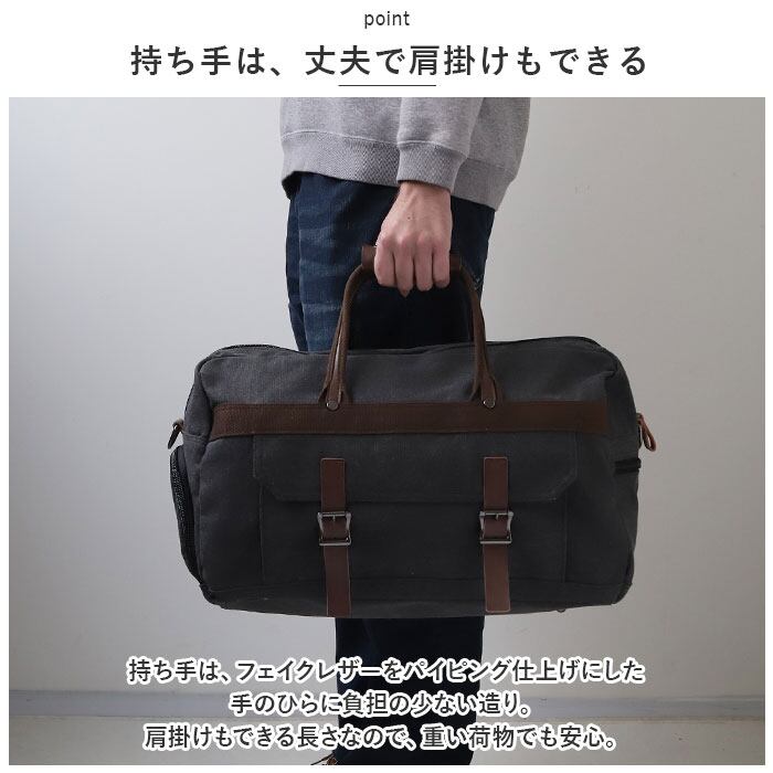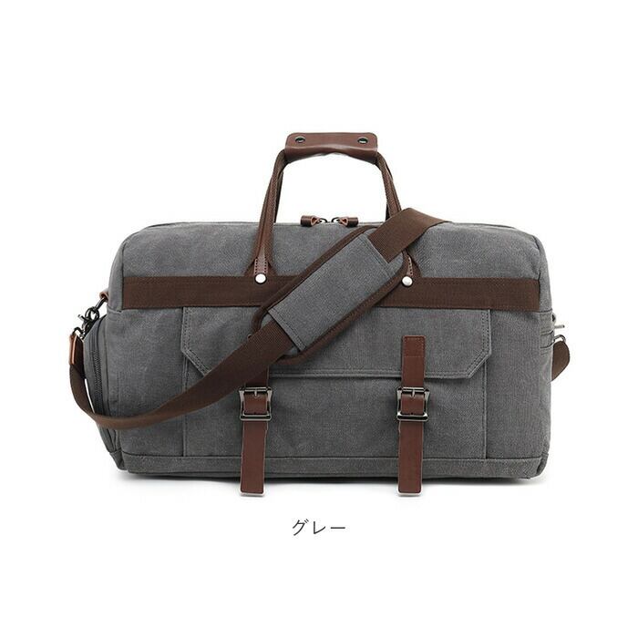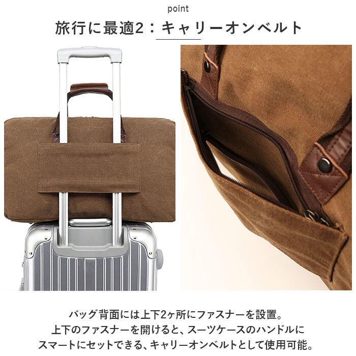 ・長年使いこんだような味わいのあるキャンバス生地に、フェイクレザーを合わせたビンテージ感溢れるルックスが特徴。旅行だけなくタウンユースにもGood!