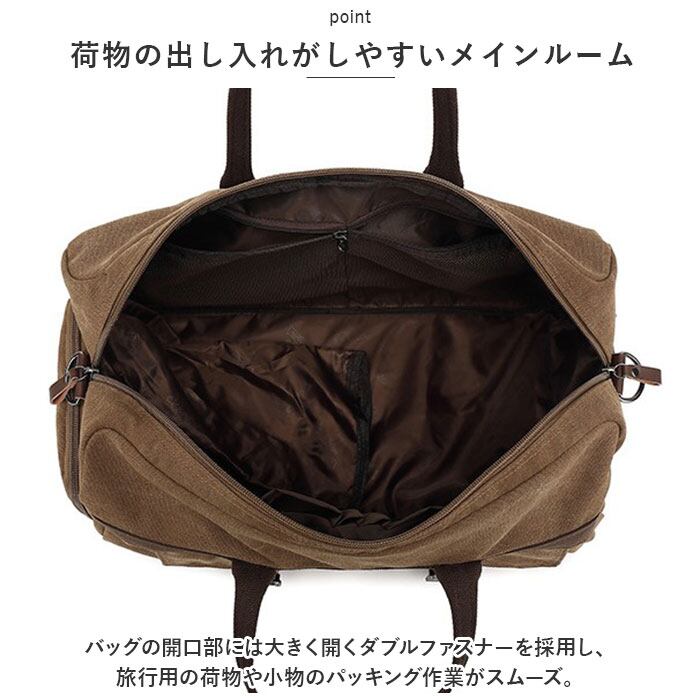 ・バッグの開口部には大きく開くダブルファスナーを採用し、旅行用の荷物や小物のパッキング作業がスムーズ。
