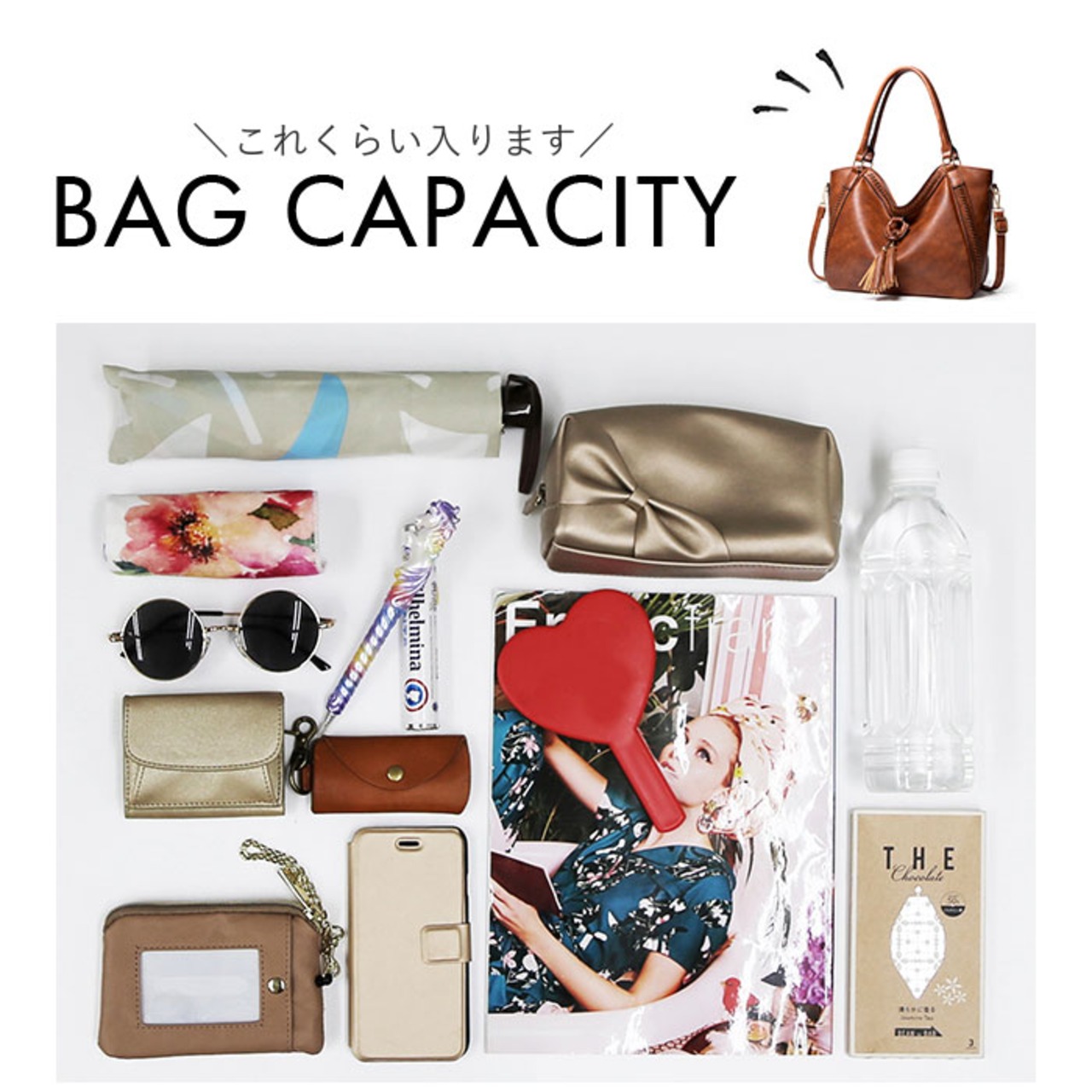 ・フロントのタッセルチャームや異素材を組み合わせたデザインがポイント。