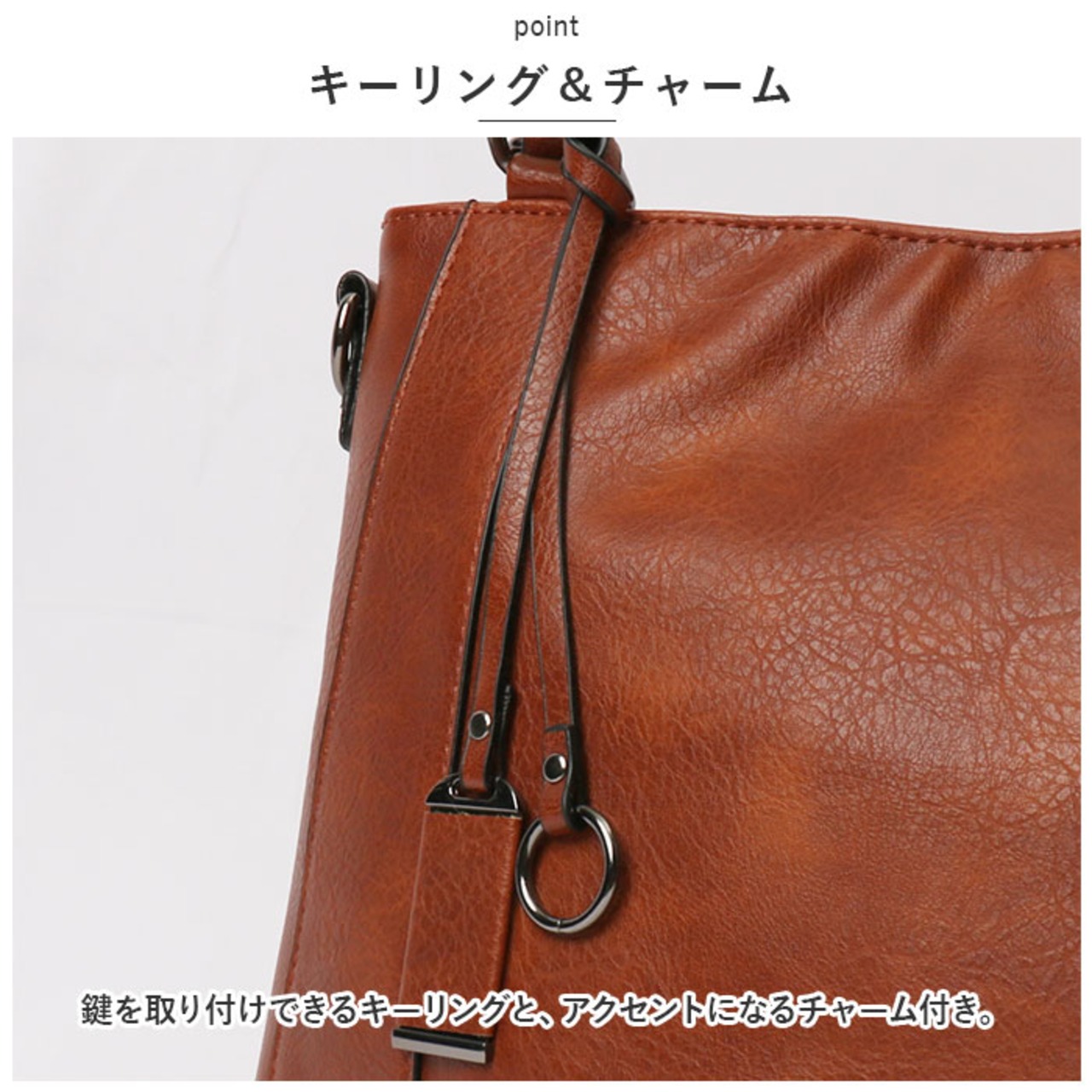 ・鍵を取り付けできるキーリングと、アクセントになるチャーム付き。