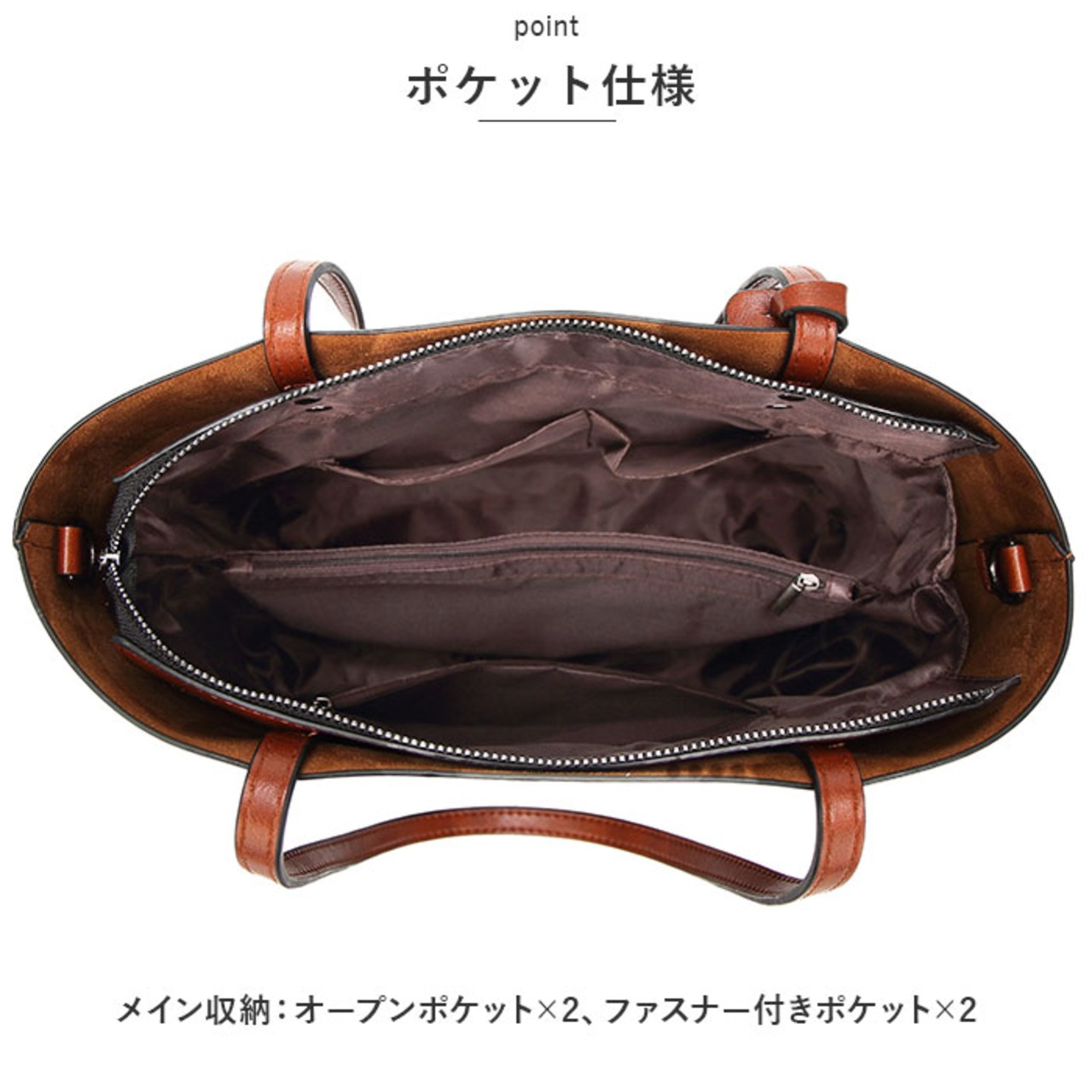 ・メイン収納:オープンポケット×2、ファスナー付きポケット×2