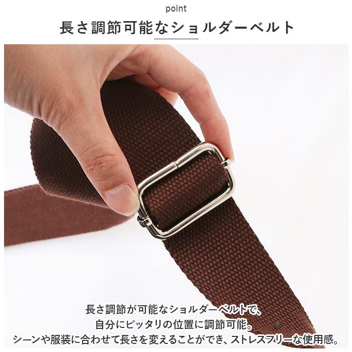 ・長さ調節が可能なショルダーベルトで、自分にピッタリの位置に調節可能。シーンや服装に合わせて長さを変えることができ、ストレスフリーな使用感。