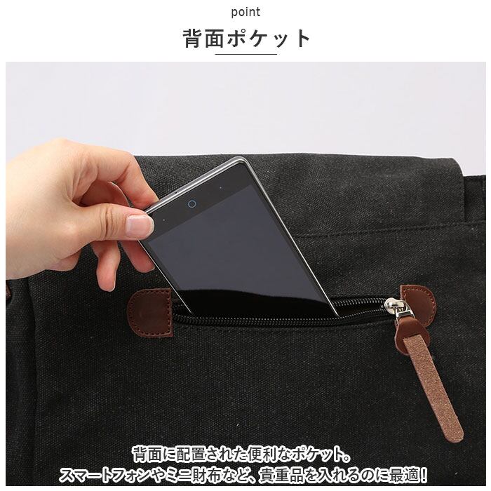 ・背面に配置された便利なポケット。スマートフォンやミニ財布など、貴重品を入れるのに最適!
