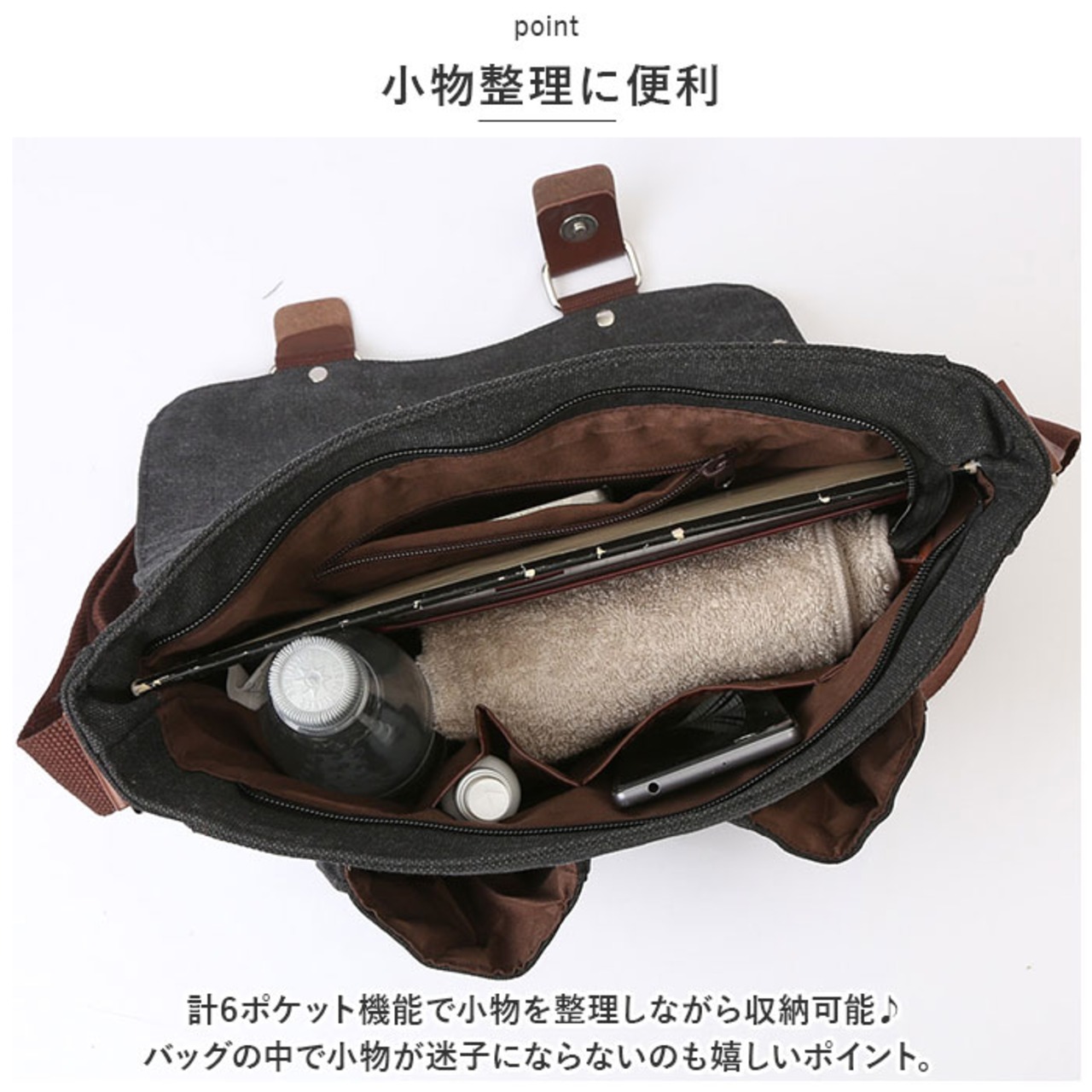 ・計6ポケット機能で小物を整理しながら収納可能♪バッグの中で小物が迷子にならないのも嬉しいポイント。