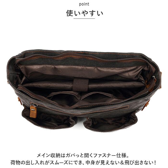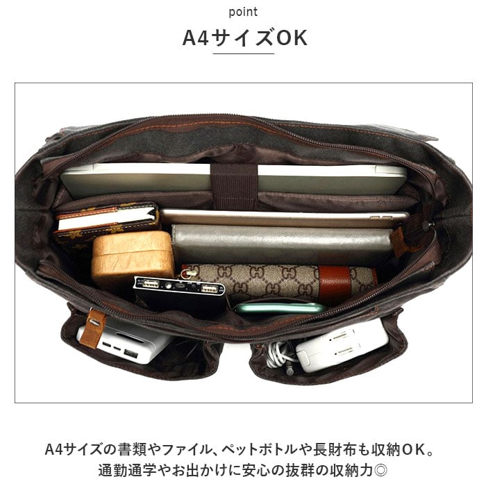 ・A4サイズの書類やファイル、ペットボトルや長財布も収納OK。通勤通学やお出かけに安心の抜群の収納力◎