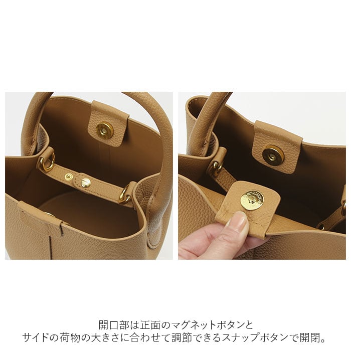 ・開口部は正面のマグネットボタンとサイドの荷物の大きさに合わせて調節できるスナップボタンで開閉。