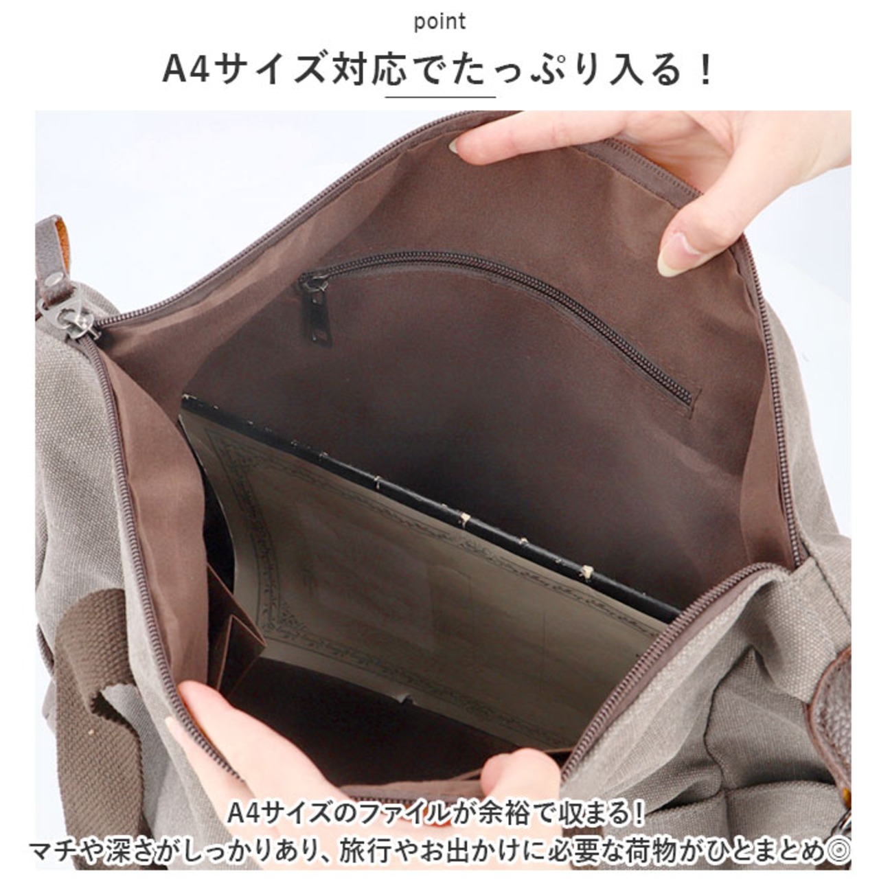 ・A4サイズのファイルが余裕で収まる!マチや深さがしっかりあり、旅行やお出かけに必要な荷物がひとまとめ◎