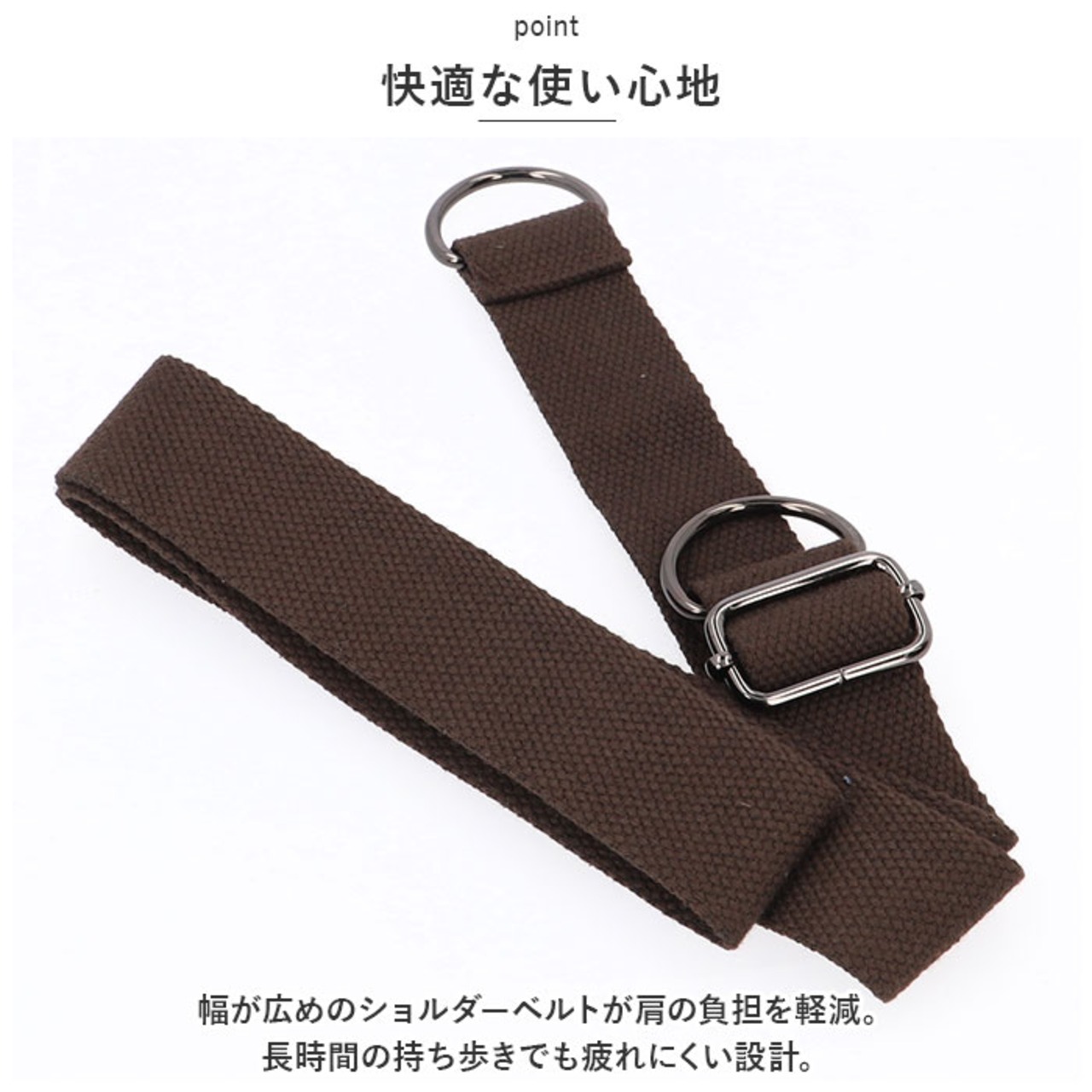 ・幅が広めのショルダーベルトが肩の負担を軽減。長時間の持ち歩きでも疲れにくい設計。