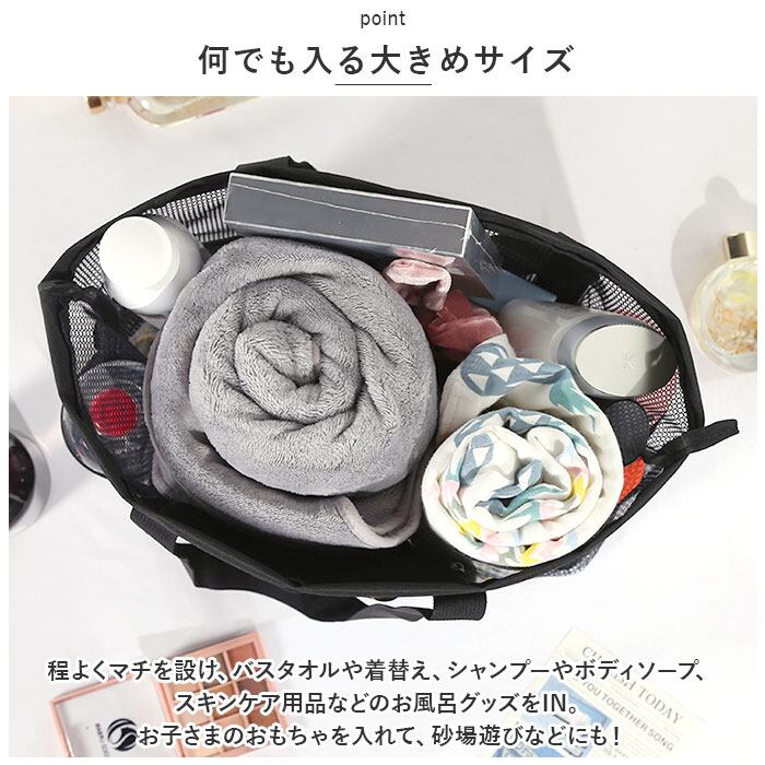 ・程よくマチを設け、バスタオルや着替え、シャンプーやボディソープ、スキンケア用品などのお風呂グッズをIN。お子さまのおもちゃを入れて、砂場遊びなどにも!