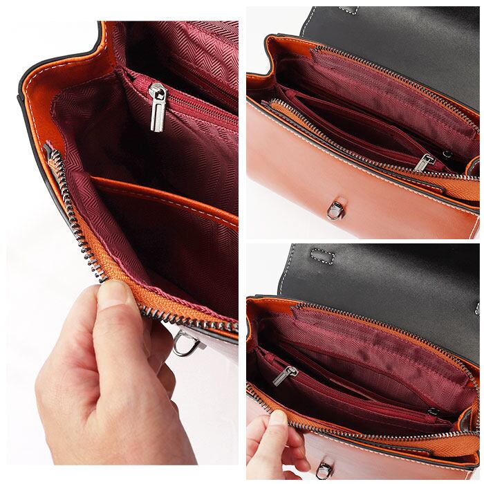 ・フラップを開けると中央に仕切りになるファスナーポケットやオープンポケットなど小物を仕分けて収納可能◎