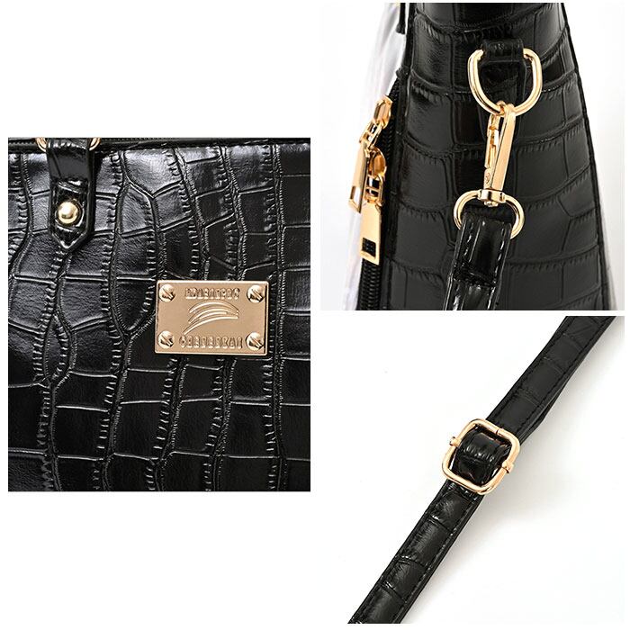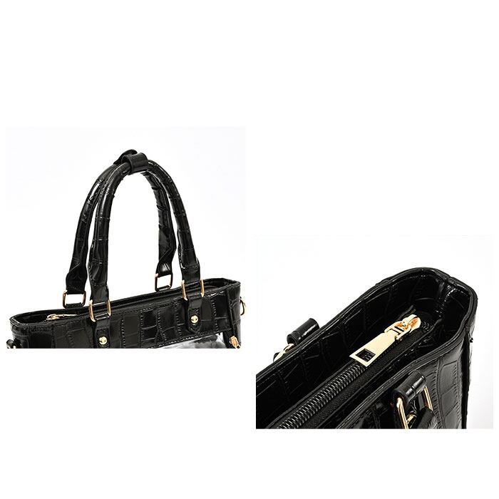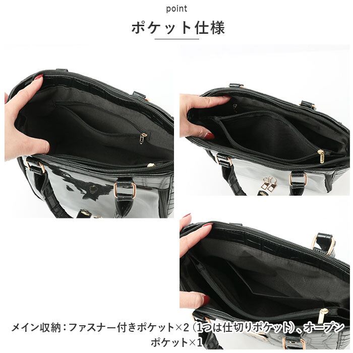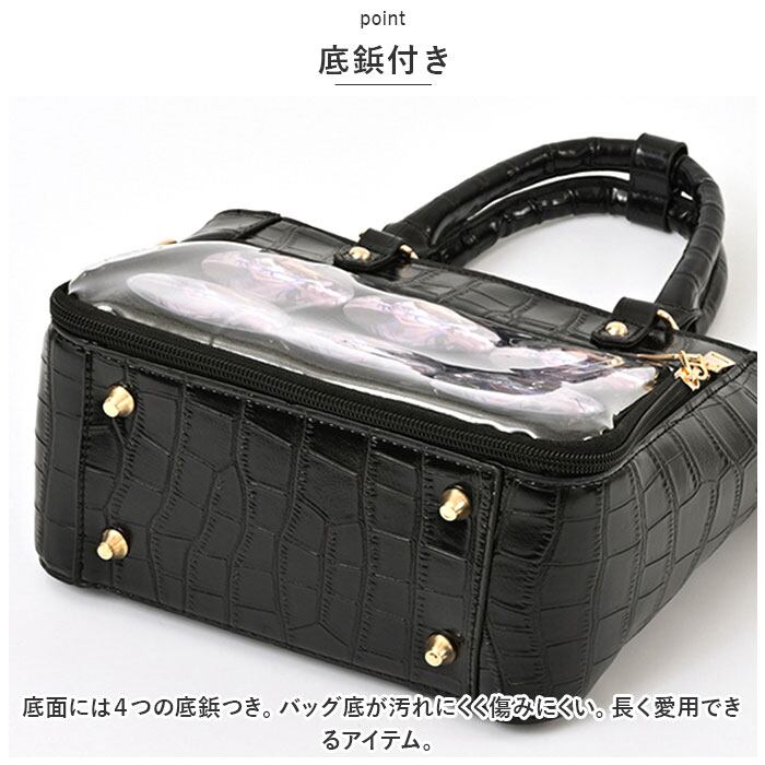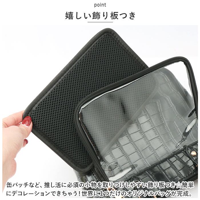 ・フェイクレザー仕様の大人のハンドバッグ風に仕上げたアイテム。クロコダイル調のエンボス加工で上品な雰囲気。大人も持てる痛バッグ。