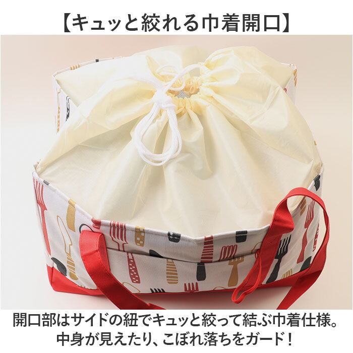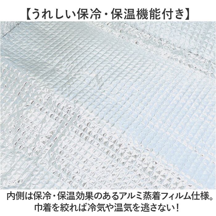 ・内側は保冷・保温効果のあるアルミ蒸着フィルム仕様。巾着を絞れば冷気や温気を逃さない!