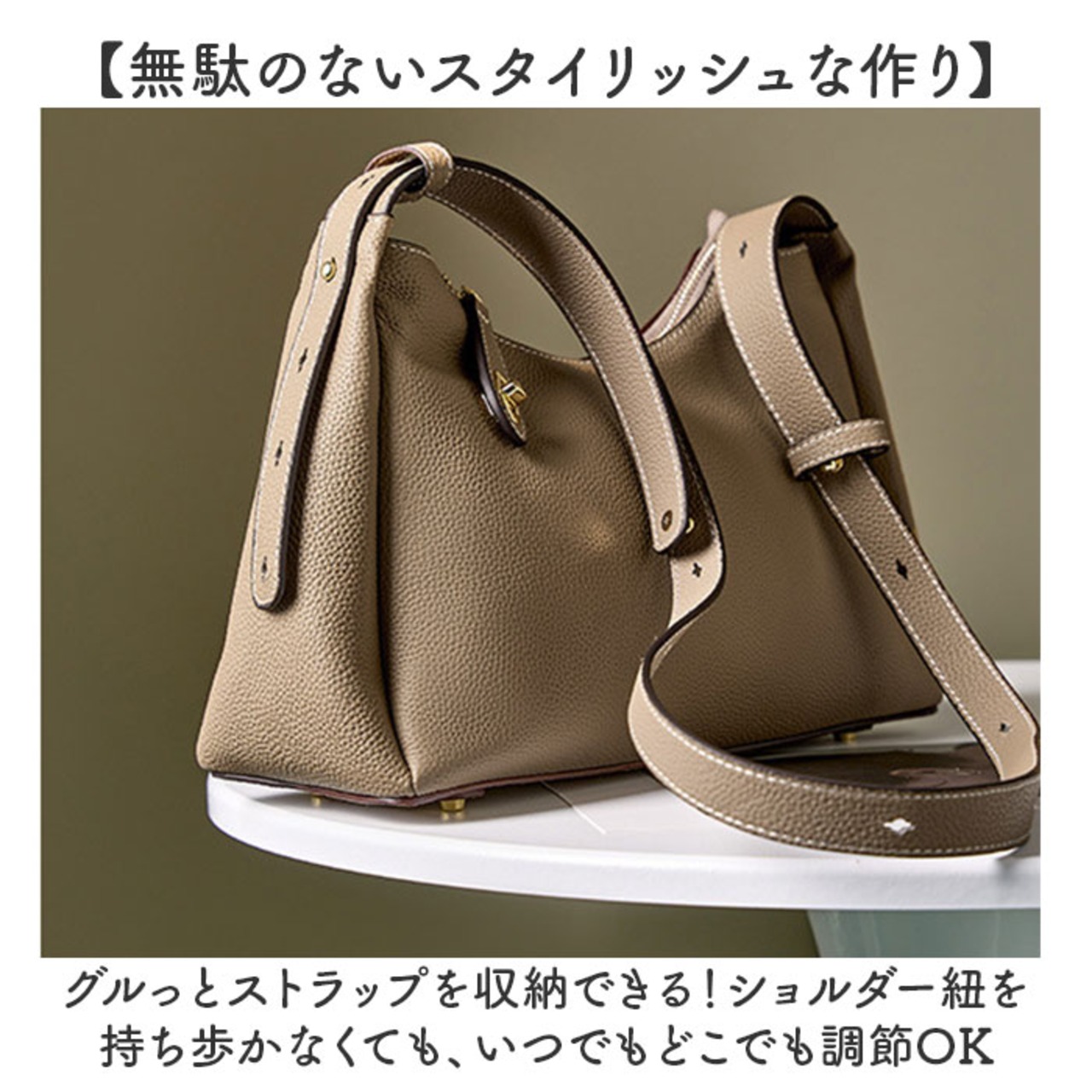 ・グルっとストラップを収納できる!ショルダー紐を持ち歩かなくても、いつでもどこでも調節OK