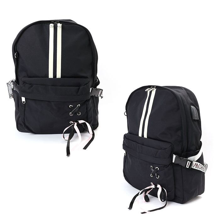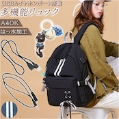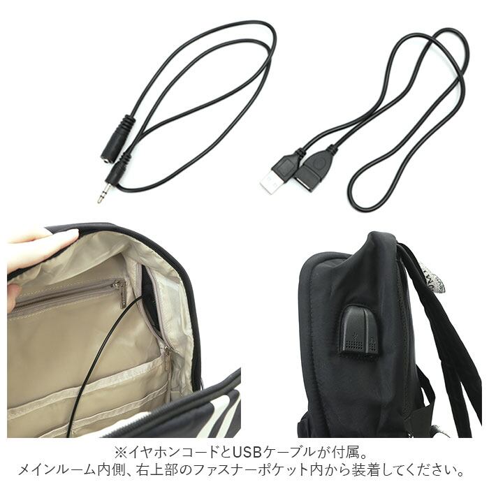 ・右サイドにUSBポートとイヤホンポートを搭載。音楽を聴いたり、スマホを充電しながらの移動も快適♪(※イヤホンコードとUSBケーブルが付属。メインルーム内側、右上部のファスナーポケット内から装着してください。)