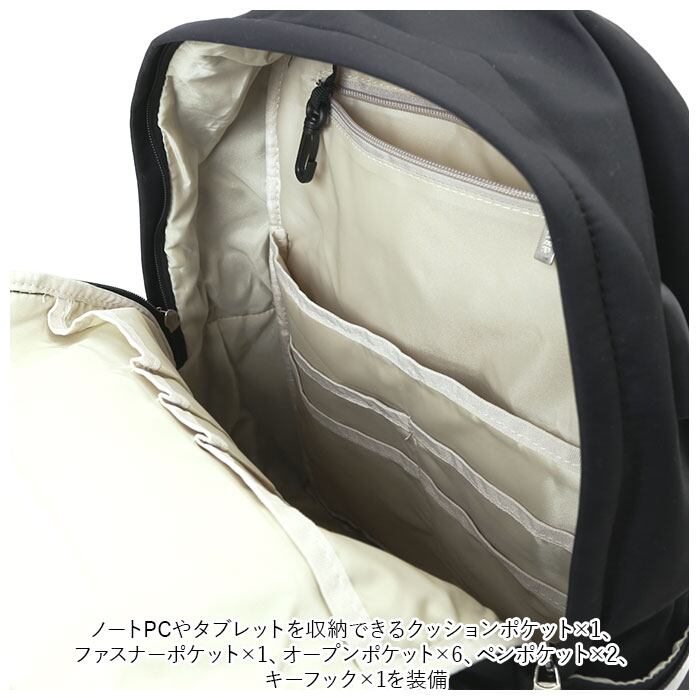 ・ノートPCやタブレットを収納できるクッションポケット×1、ファスナーポケット×1、オープンポケット×6、ペンポケット×2、キーフック×1を装備。