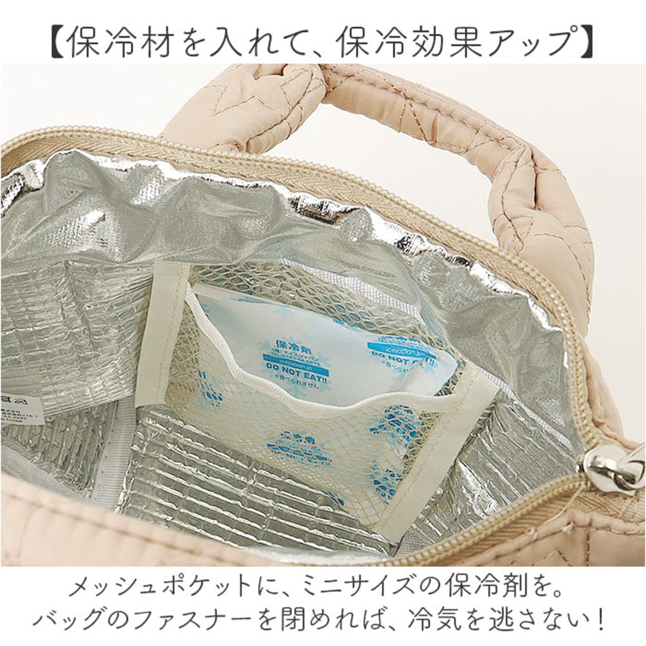 ・メッシュポケットに、ミニサイズの保冷剤を。バッグのファスナーを閉めれば、冷気を逃さない!