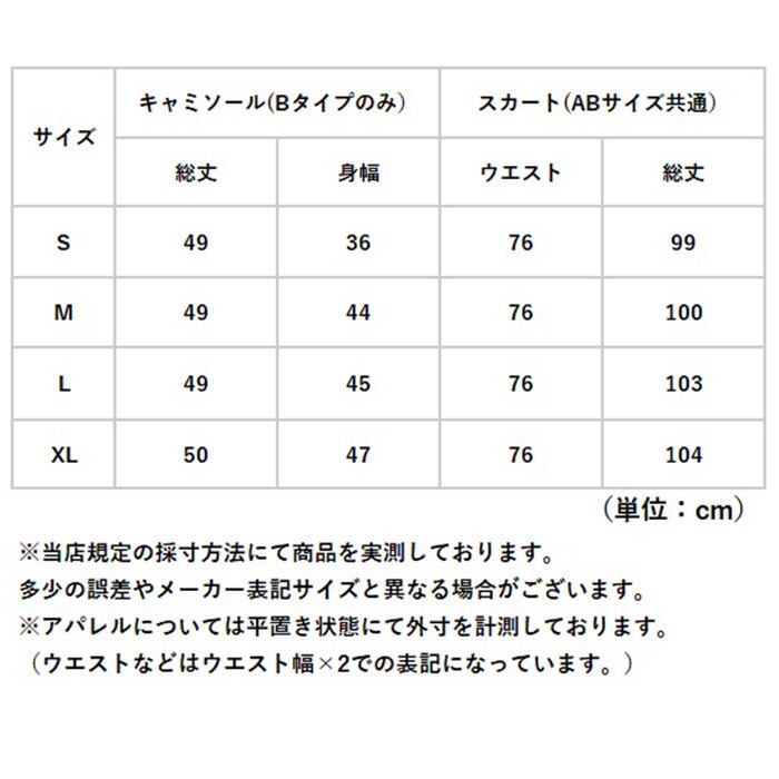 ・トップス、スカート、紐のAタイプをご用意。トップス、スカート、紐、キャミソールのBタイプ。