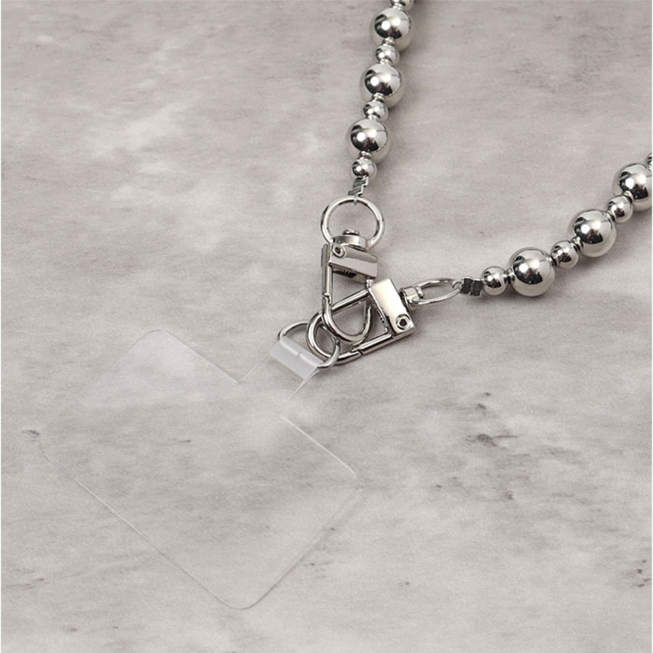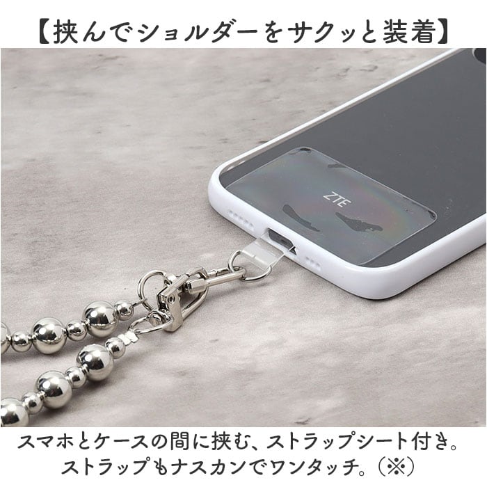 ・スマホとケースの間に挟む、ストラップシート付き。ストラップもナスカンでワンタッチ。