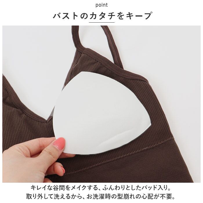 ・キレイな谷間をメイクする、ふんわりとしたパッド入り。取り外して洗えるから、お洗濯時の型崩れの心配が不要。