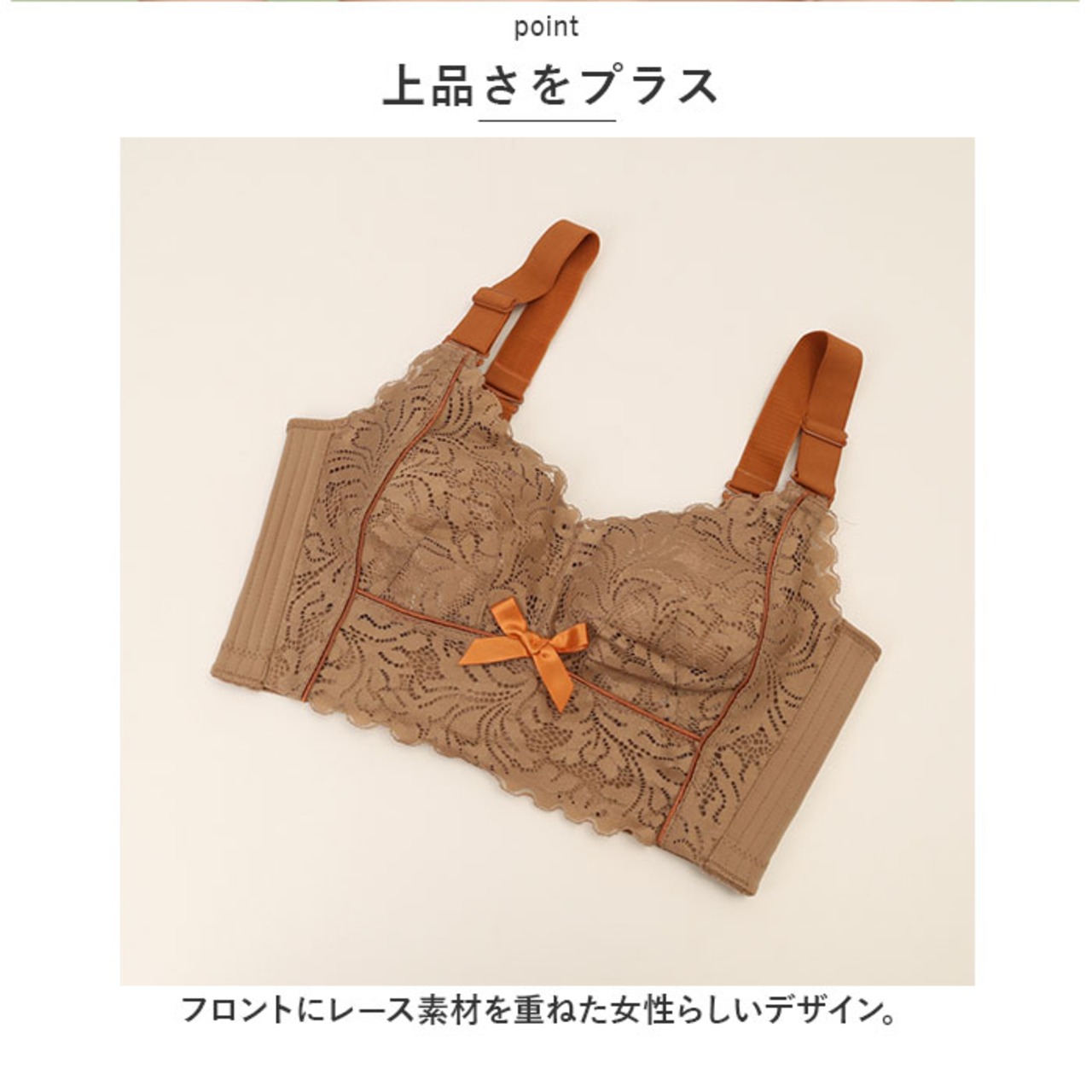 ・フロントにレース素材を重ねた女性らしいデザイン。