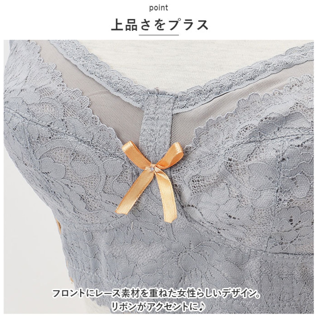 ・フロントにレース素材を重ねた女性らしいデザイン。リボンがアクセントに♪
