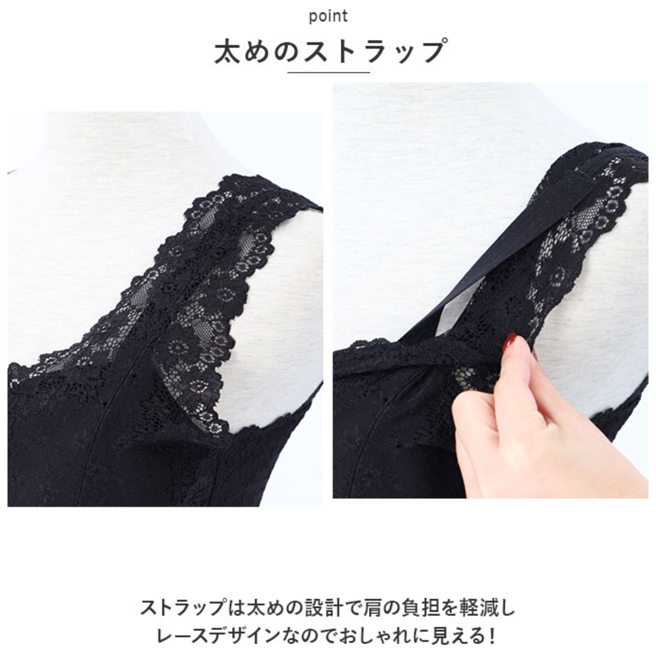 ・ストラップは太めの設計で肩の負担を軽減し、レースデザインなのでおしゃれに見える!