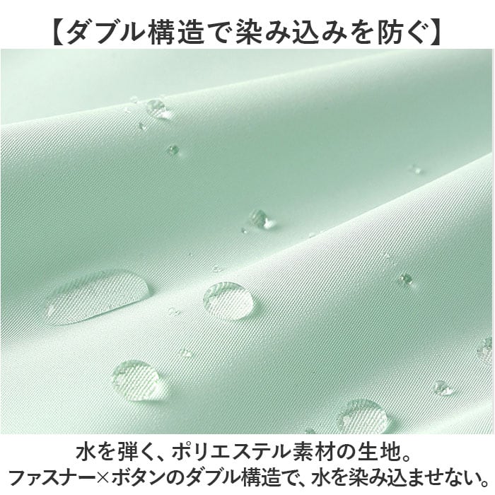 ・水を弾く、ポリエステル素材の生地。ファスナー×ボタンのダブル構造で、水を染み込ませない。