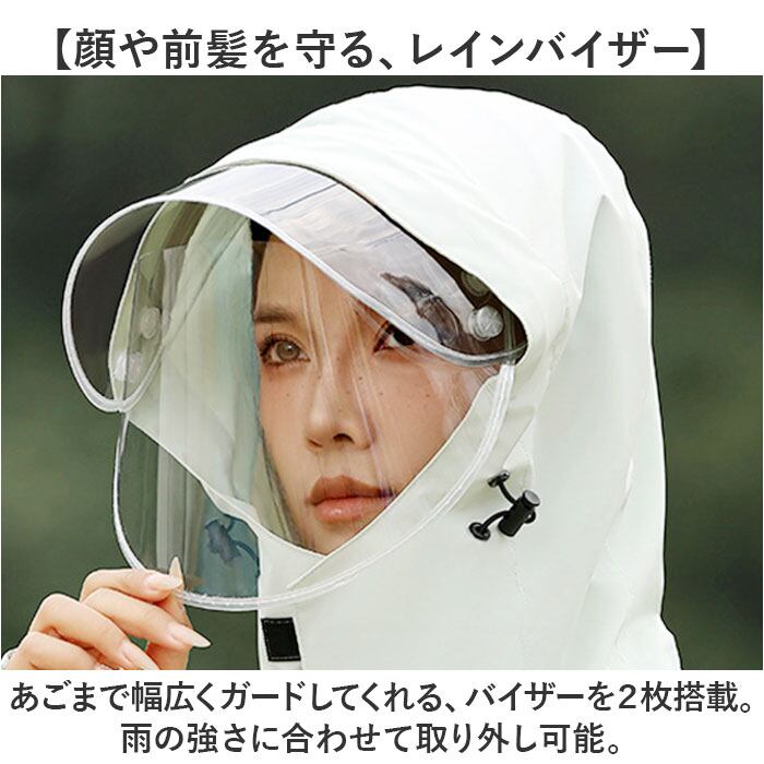 ・あごまで幅広くガードしてくれる、バイザーを2枚搭載。雨の強さに合わせて取り外し可能。