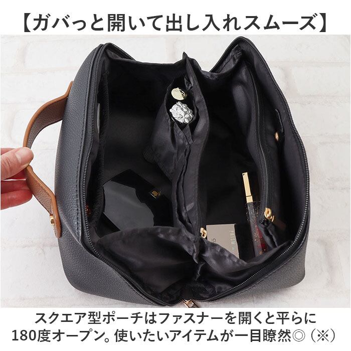 ・スクエア型ポーチはファスナーを開くと平らに180度オープン。使いたいアイテムが一目瞭然◎