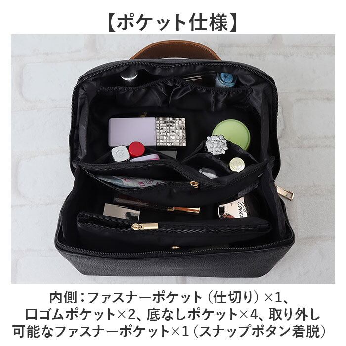 ・内側:ファスナーポケット(仕切り)×1、口ゴムポケット×2、底なしポケット×4、取り外し可能なファスナーポケット×1(スナップボタン着脱)