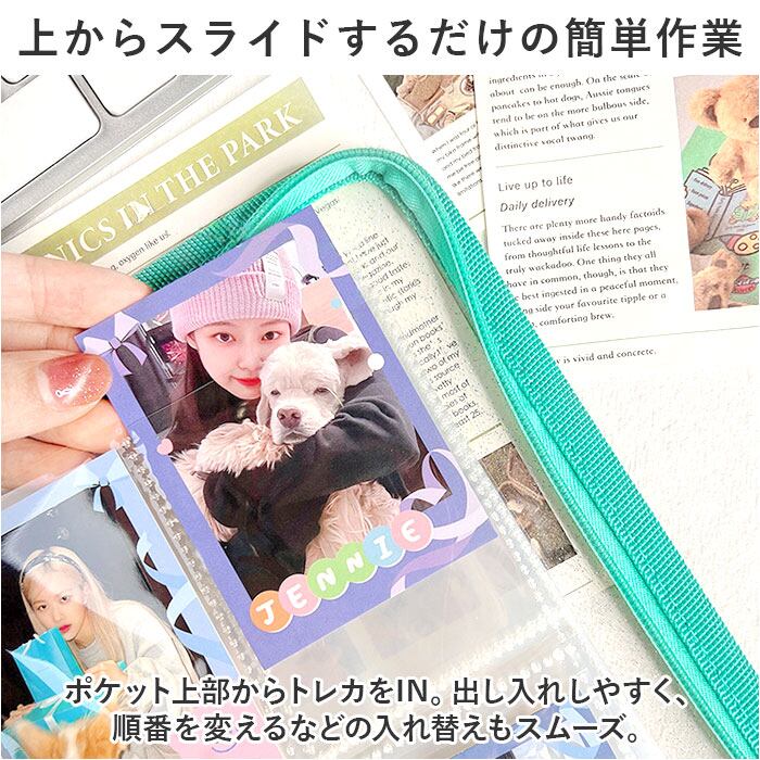 ・ポケット上部からトレカをIN。出し入れしやすく、順番を変えるなどの入れ替えもスムーズ。