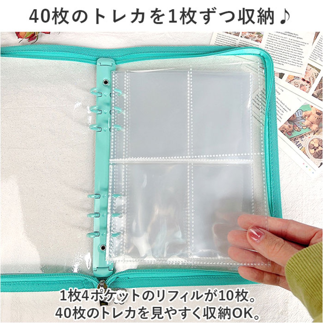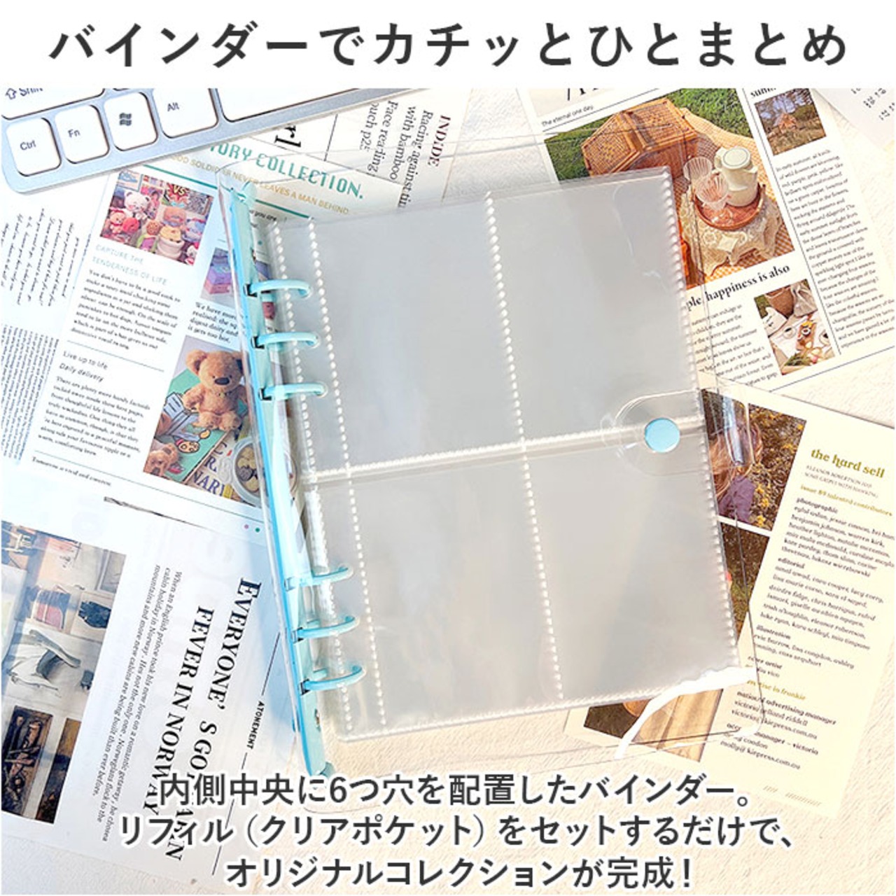 ・内側中央に6つ穴を配置したバインダー。リフィル(クリアポケット)をセットするだけで、オリジナルコレクションが完成!