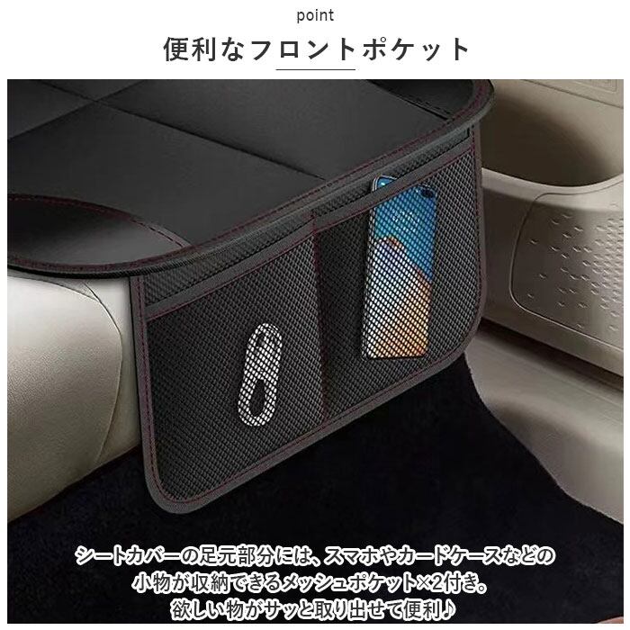 ・シートカバーの足元部分には、スマホやカードケースなどの小物が収納できるメッシュポケット×2付き。欲しい物がサッと取り出せて便利♪