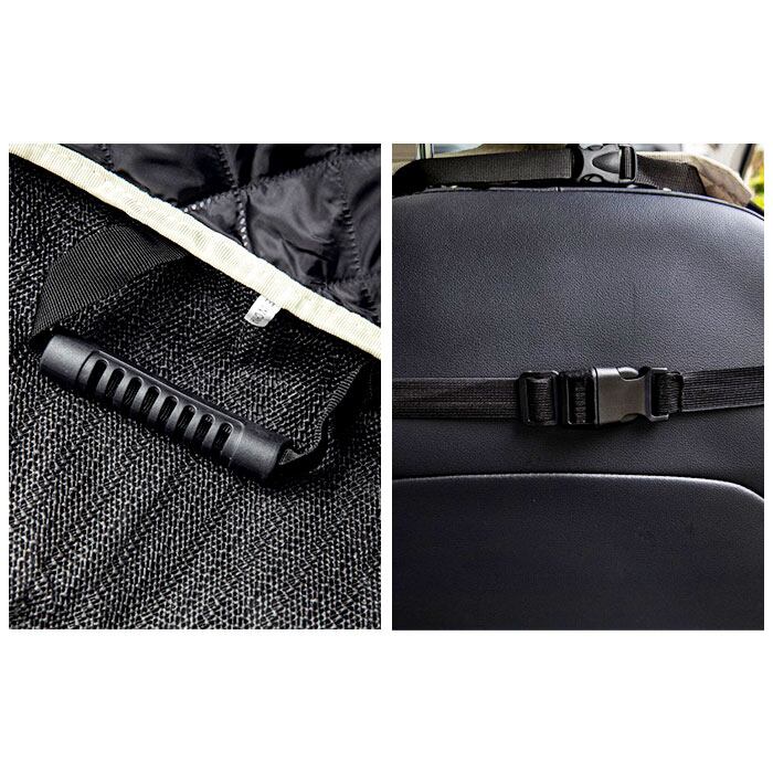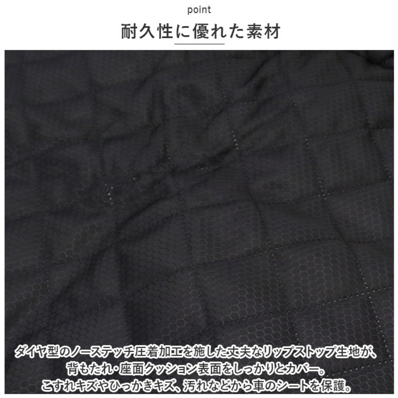 ・ダイヤ型のノーステッチ圧着加工を施した丈夫なリップストップ生地が、背もたれ・座面クッション表面をしっかりとカバー。こすれキズやひっかきキズ、汚れなどから車のシートを保護。