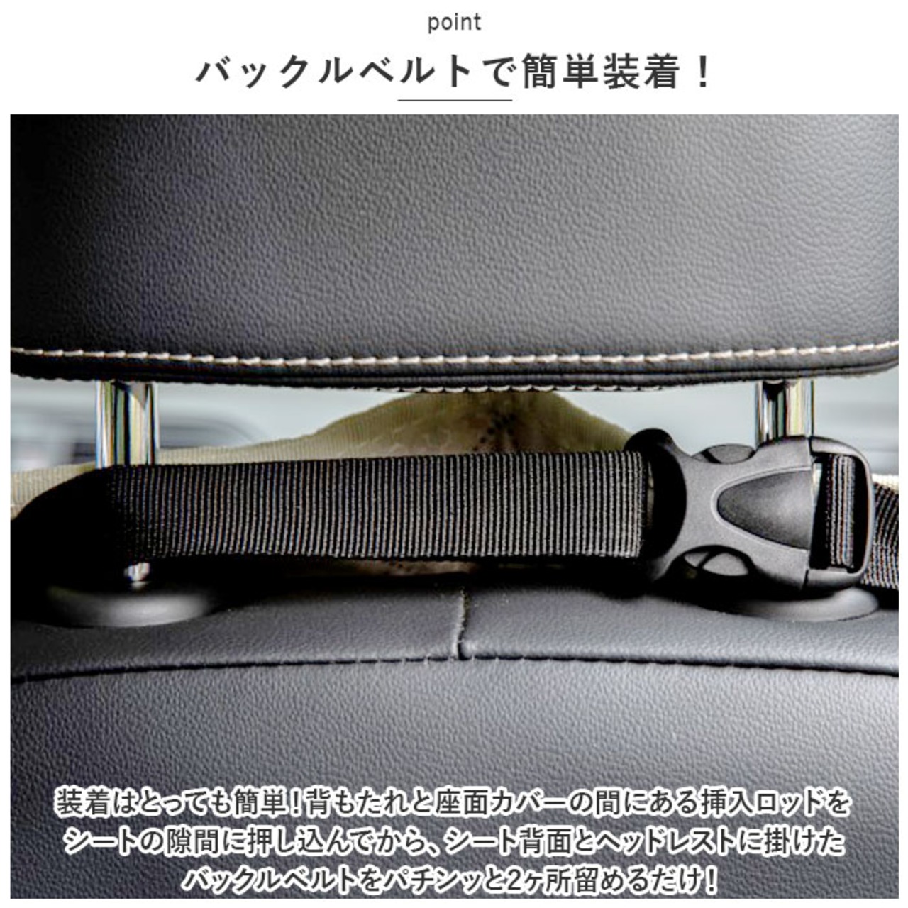 ・装着はとっても簡単!背もたれと座面カバーの間にある挿入ロッドをシートの隙間に押し込んでから、シート背面とヘッドレストに掛けたバックルベルトをパチンッと2ヶ所留めるだけ!