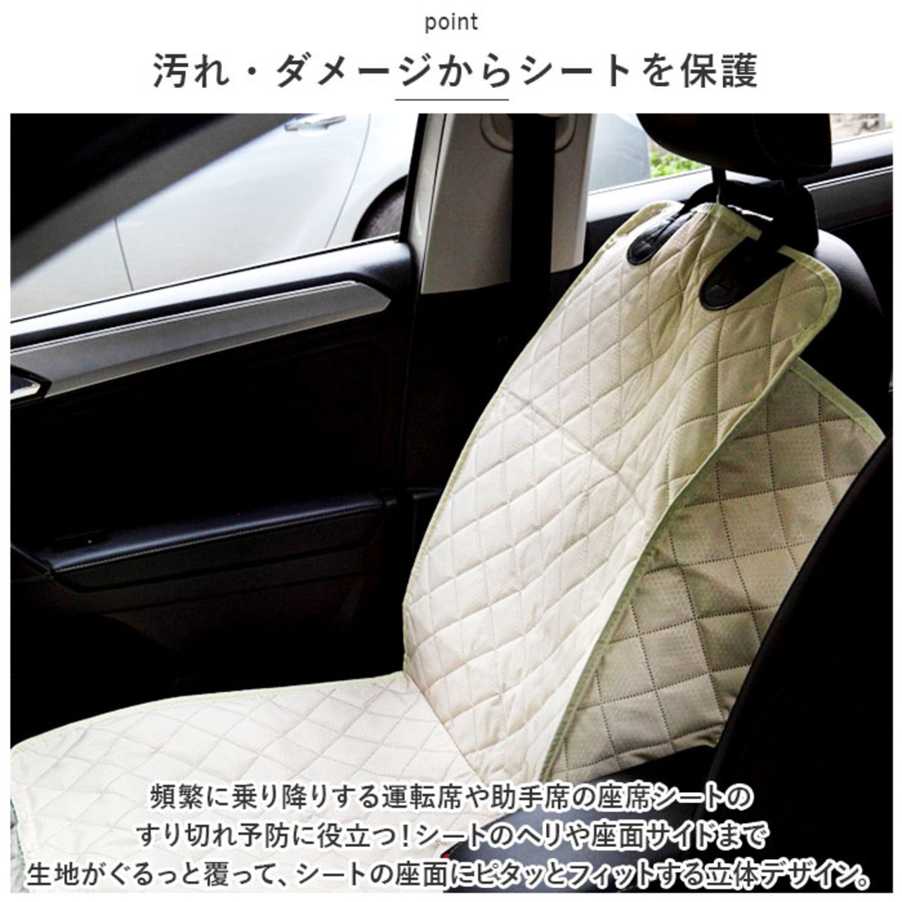 ・頻繁に乗り降りする運転席や助手席の座席シートのすり切れ予防に役立つ!シートのヘリや座面サイドまで生地がぐるっと覆って、シートの座面にピタッとフィットする立体デザイン。