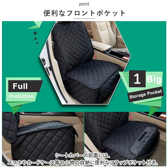 ・シートカバーの前面には、スマホやカードケース等の小物の収納に便利なフラップポケット付き。